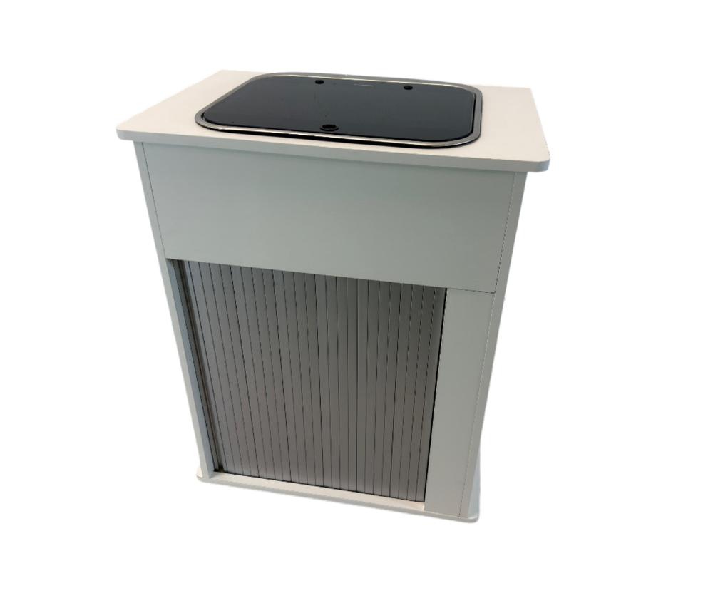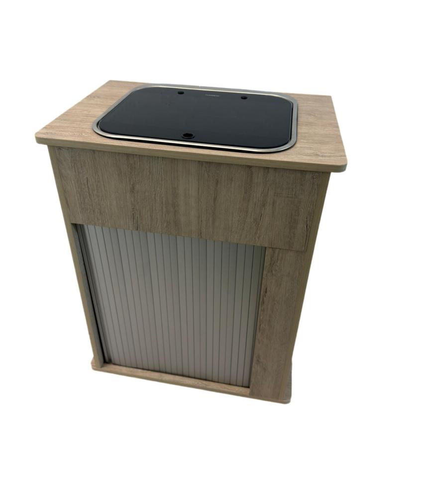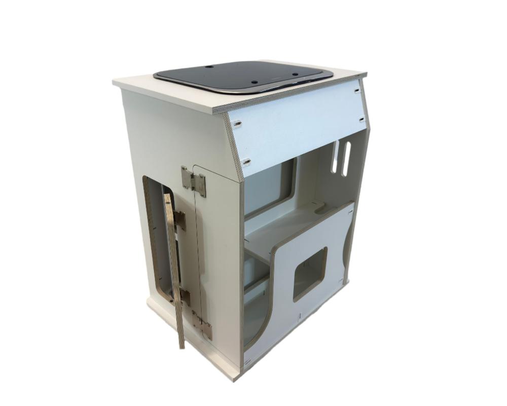 Mobiliario realizado en contrachapado fenólico aplacado en HPL por las dos caras y canteado en PVC. Dispone de 2 depósitos de 12 litros de agua limpia y aguas grises.