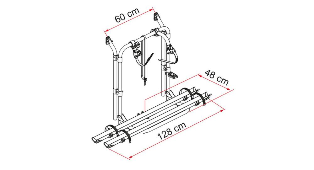 Para furgón con 2 puertas traseras. Intereje horizontal variable desde 58 cm hasta 62 cm para ajustarse mejor a los distintos tipos de portones. Los enganches superiores ocupan sólo 34 cm.