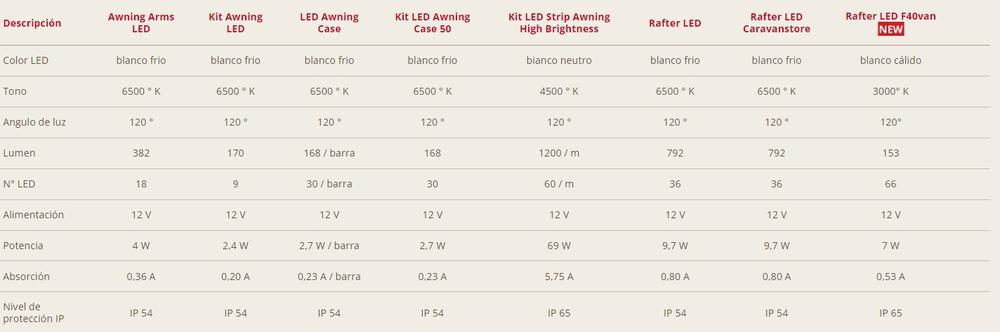 Sistema de barras de luces LED para el uso externo. Se insertan en la correspondiente guía del armazón del toldo con molinete F45s, F45L y F70.