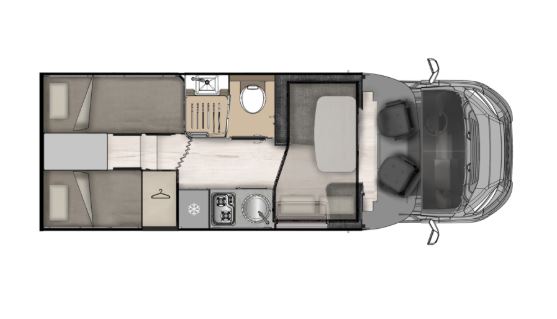 Autocaravana perfilada McLouis MC4 365 de 5 plazas de 6.99 m de largo. Año modelo 2026. Perfilada con cama basculante de menos de 7 metros de longitud con dos camas gemelas, con una de las 2 camas de 2 metros.