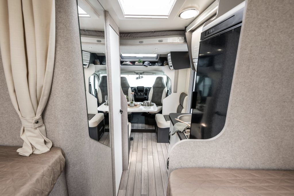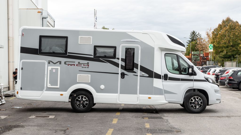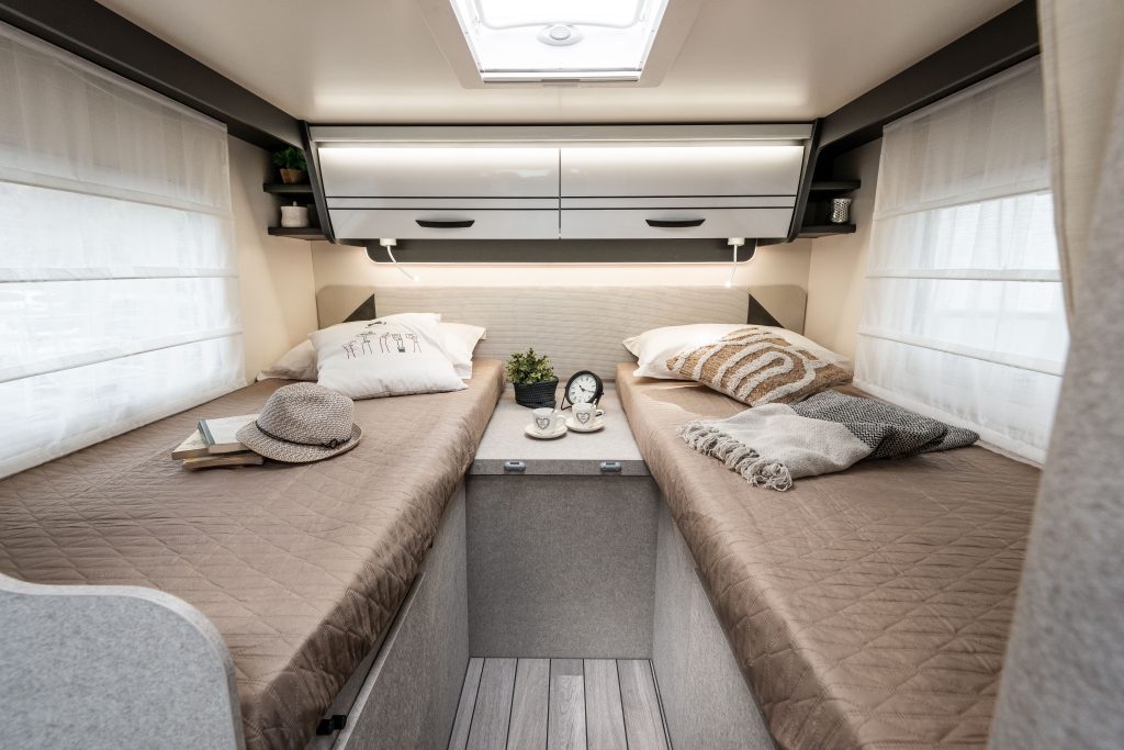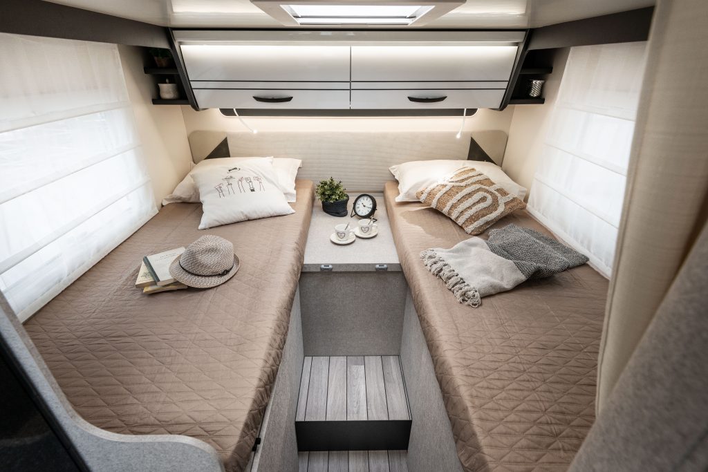 Autocaravana perfilada McLouis MC4 365 de 5 plazas de 6.99 m de largo. Año modelo 2026. Perfilada con cama basculante de menos de 7 metros de longitud con dos camas gemelas, con una de las 2 camas de 2 metros.