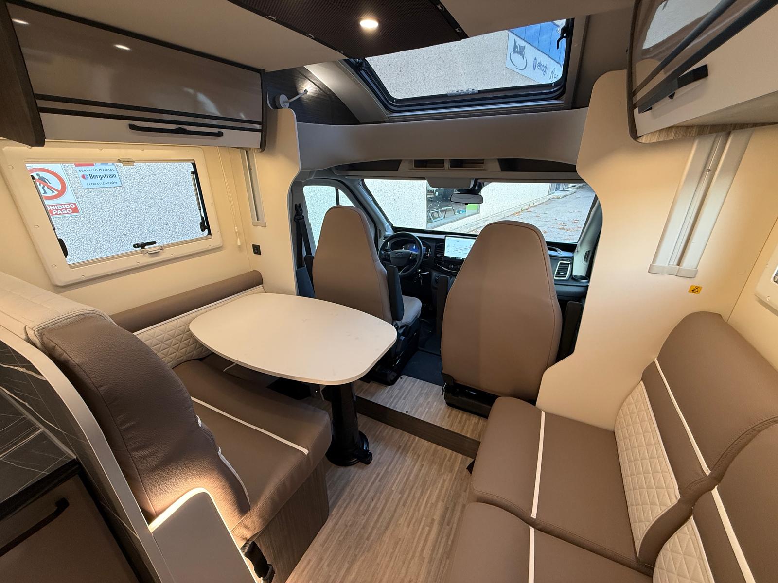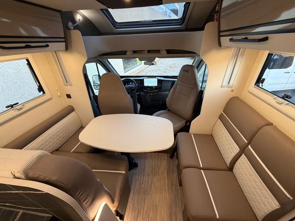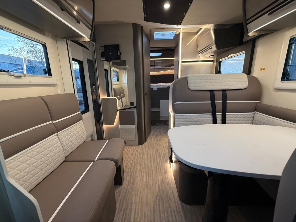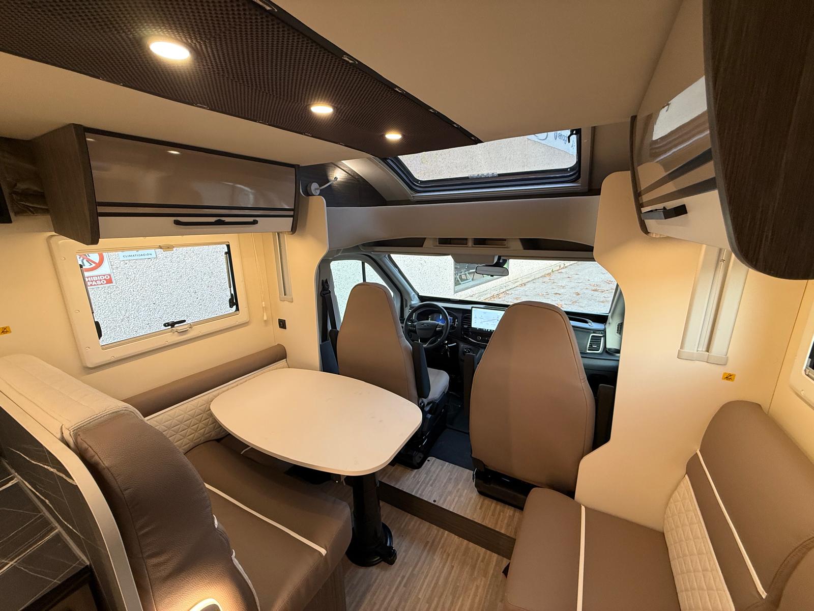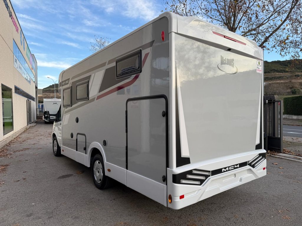 Autocaravana perfilada McLouis MC4 860 de 4 plazas de 6.99 m de largo. Año modelo 2026. Perfilada con cama basculante de menos de 7 metros de largo con cama doble trasera transversal, aseo con ducha integrada y amplio comedor con sofá angular y mesa central que se puede mover y girar 360.