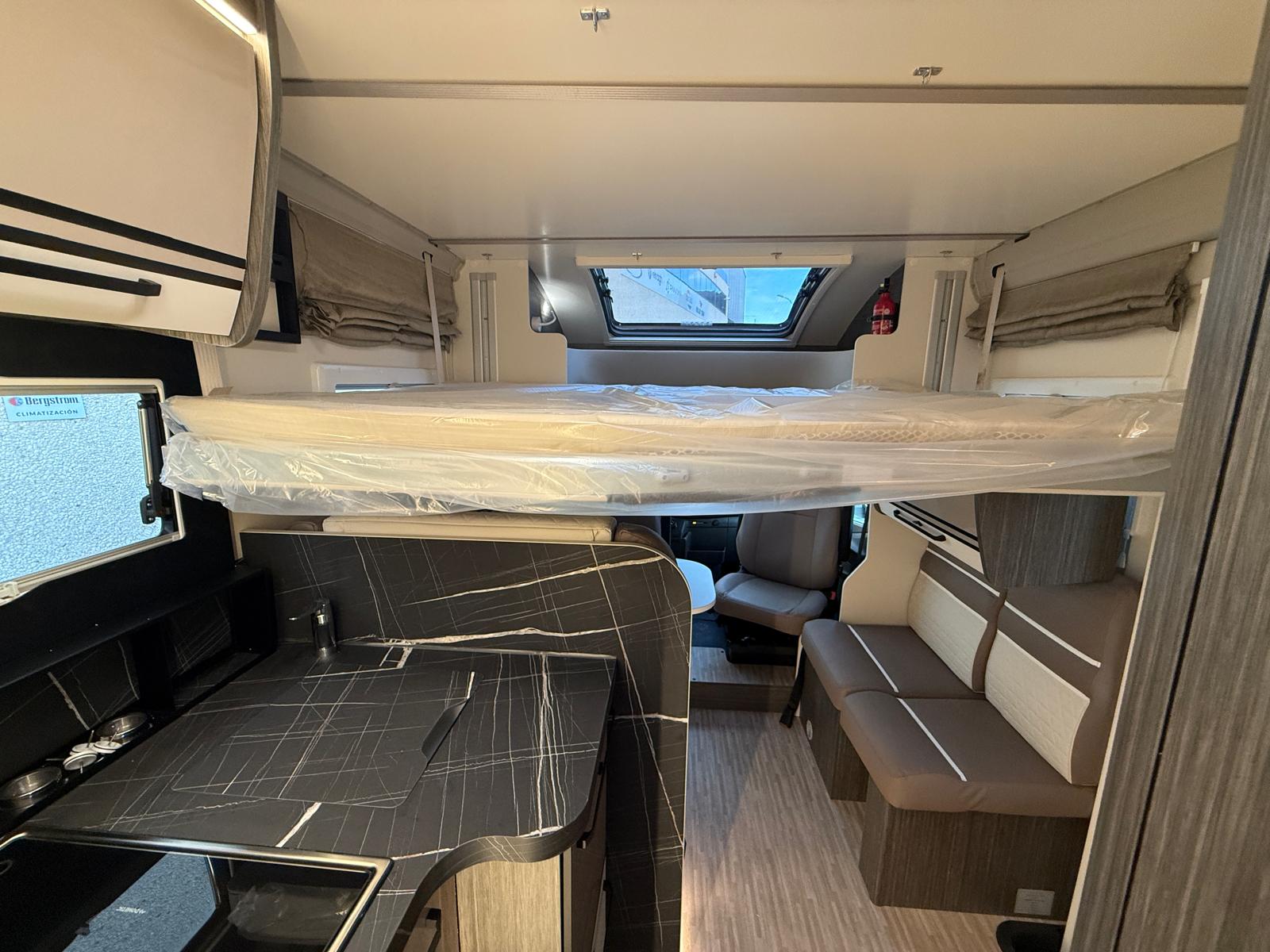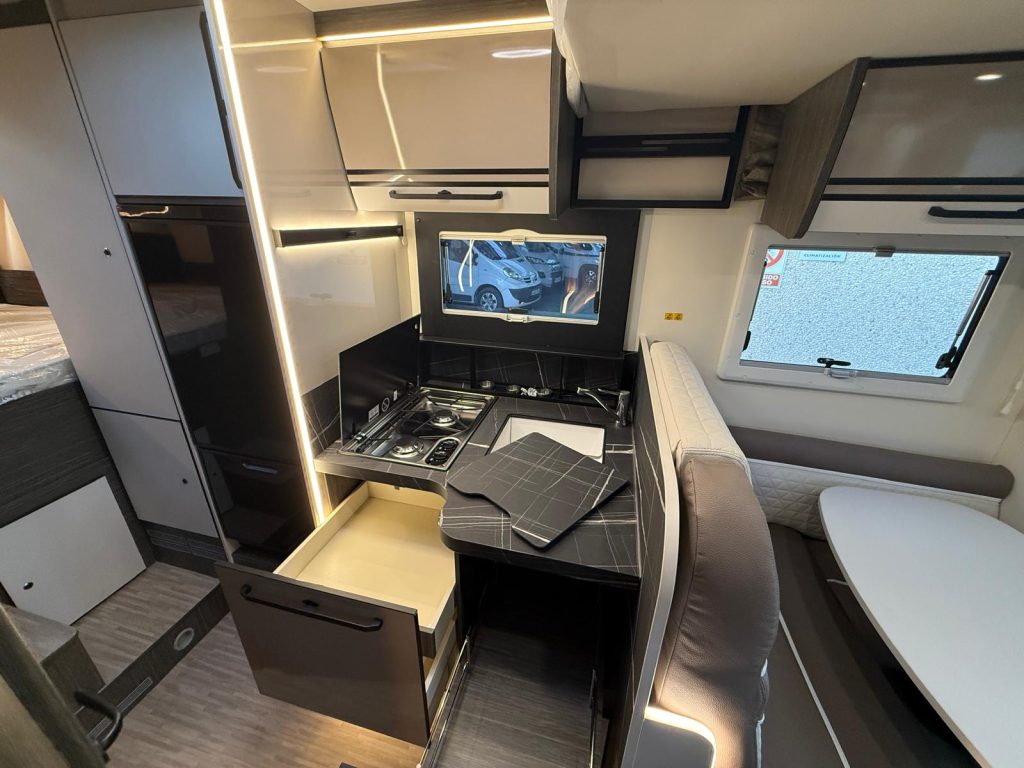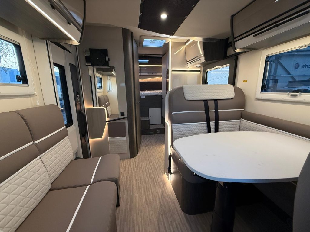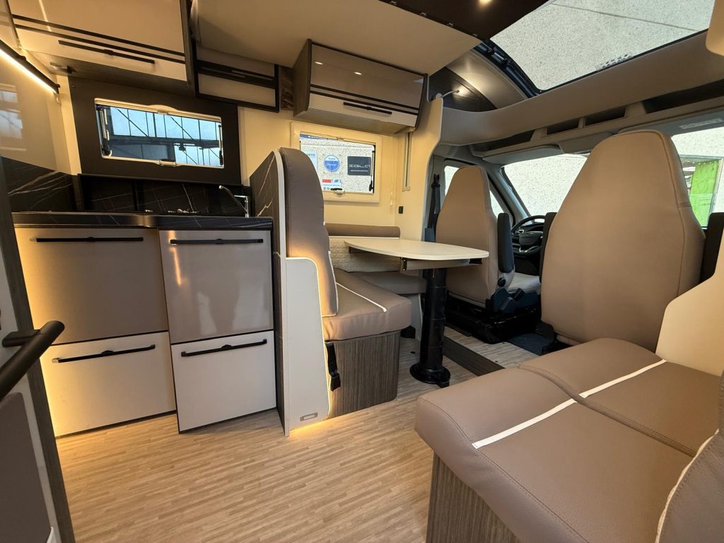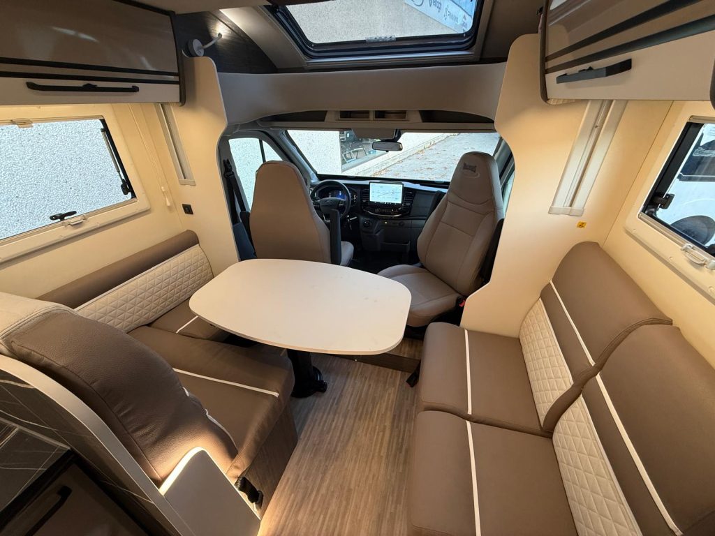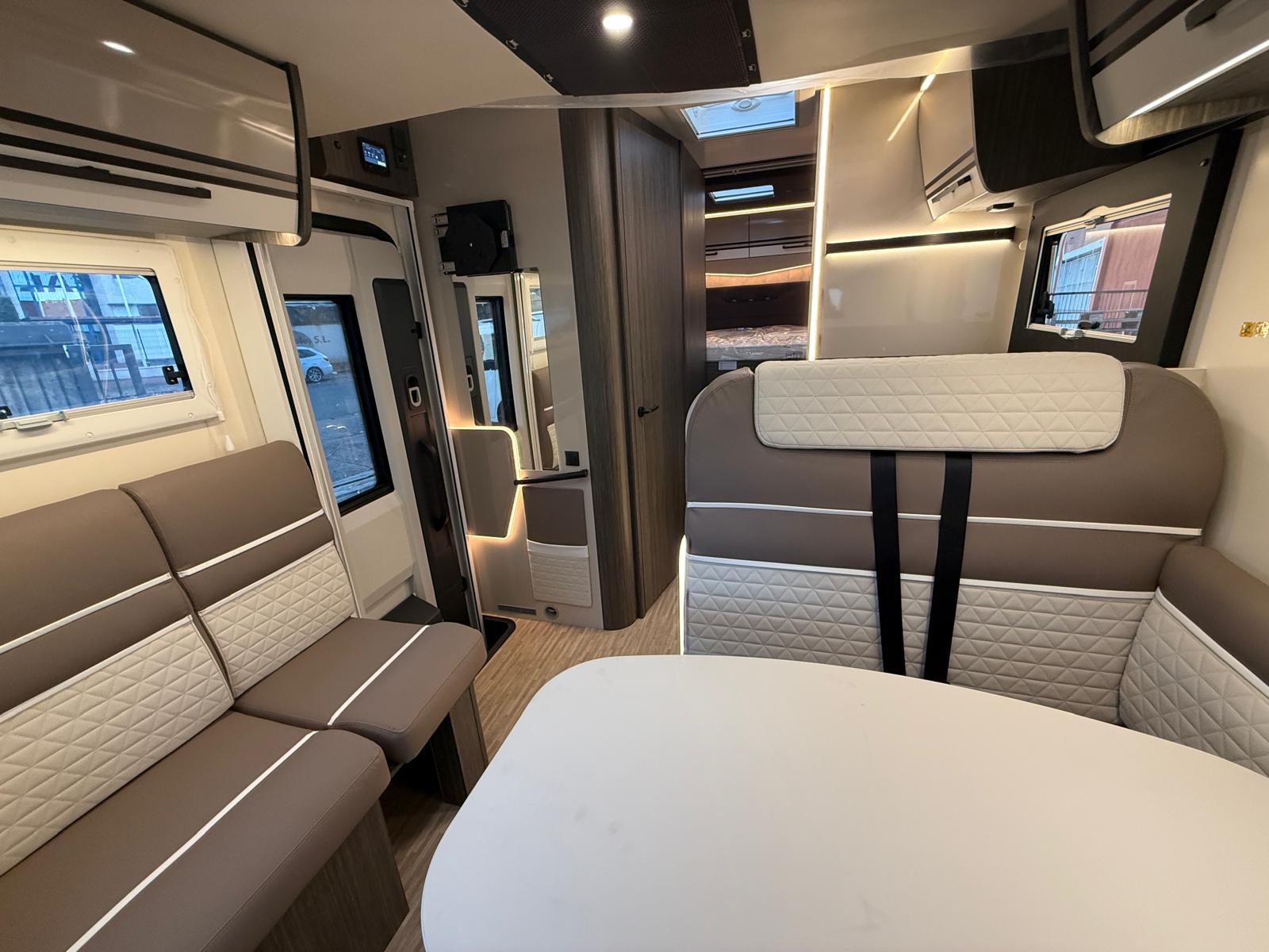 Autocaravana perfilada McLouis MC4 860 de 4 plazas de 6.99 m de largo. Año modelo 2026. Perfilada con cama basculante de menos de 7 metros de largo con cama doble trasera transversal, aseo con ducha integrada y amplio comedor con sofá angular y mesa central que se puede mover y girar 360.