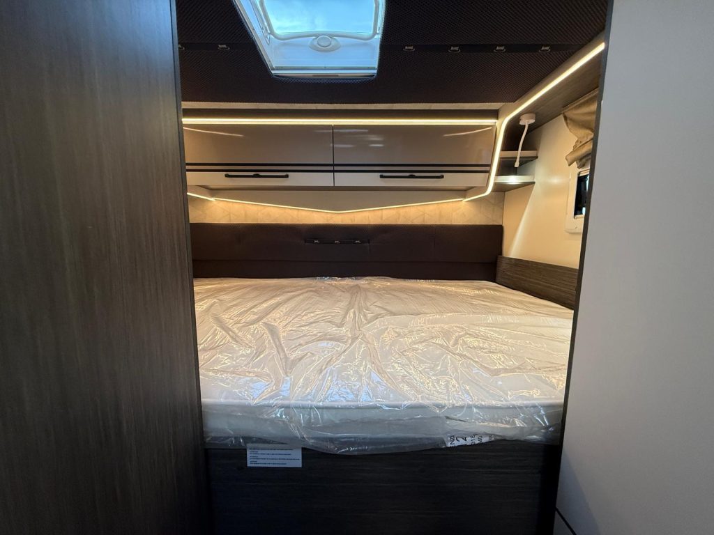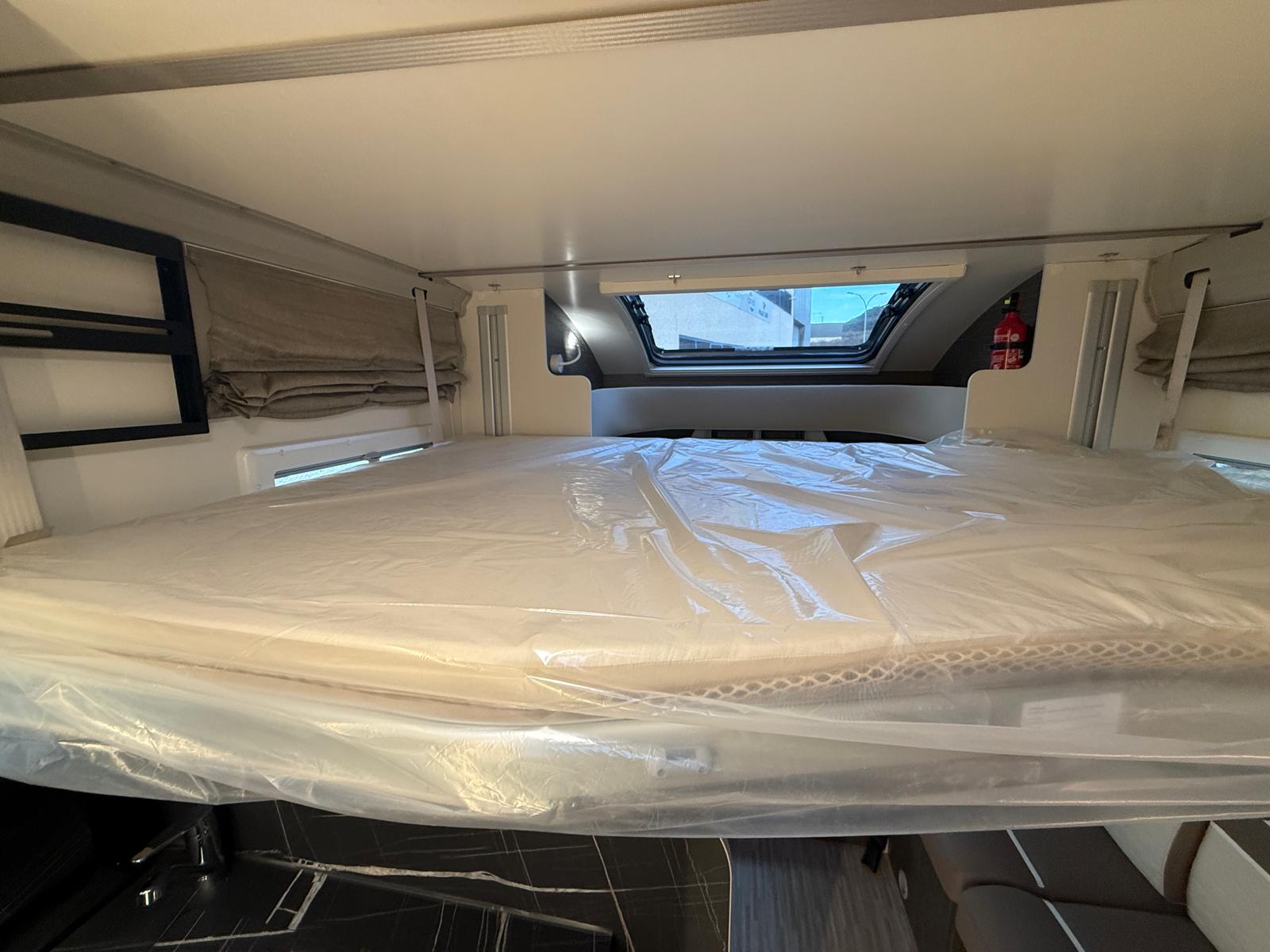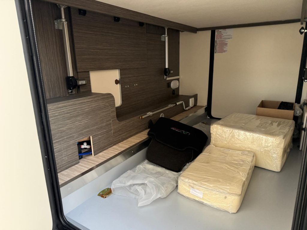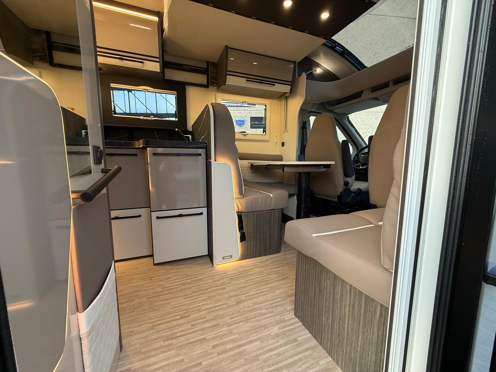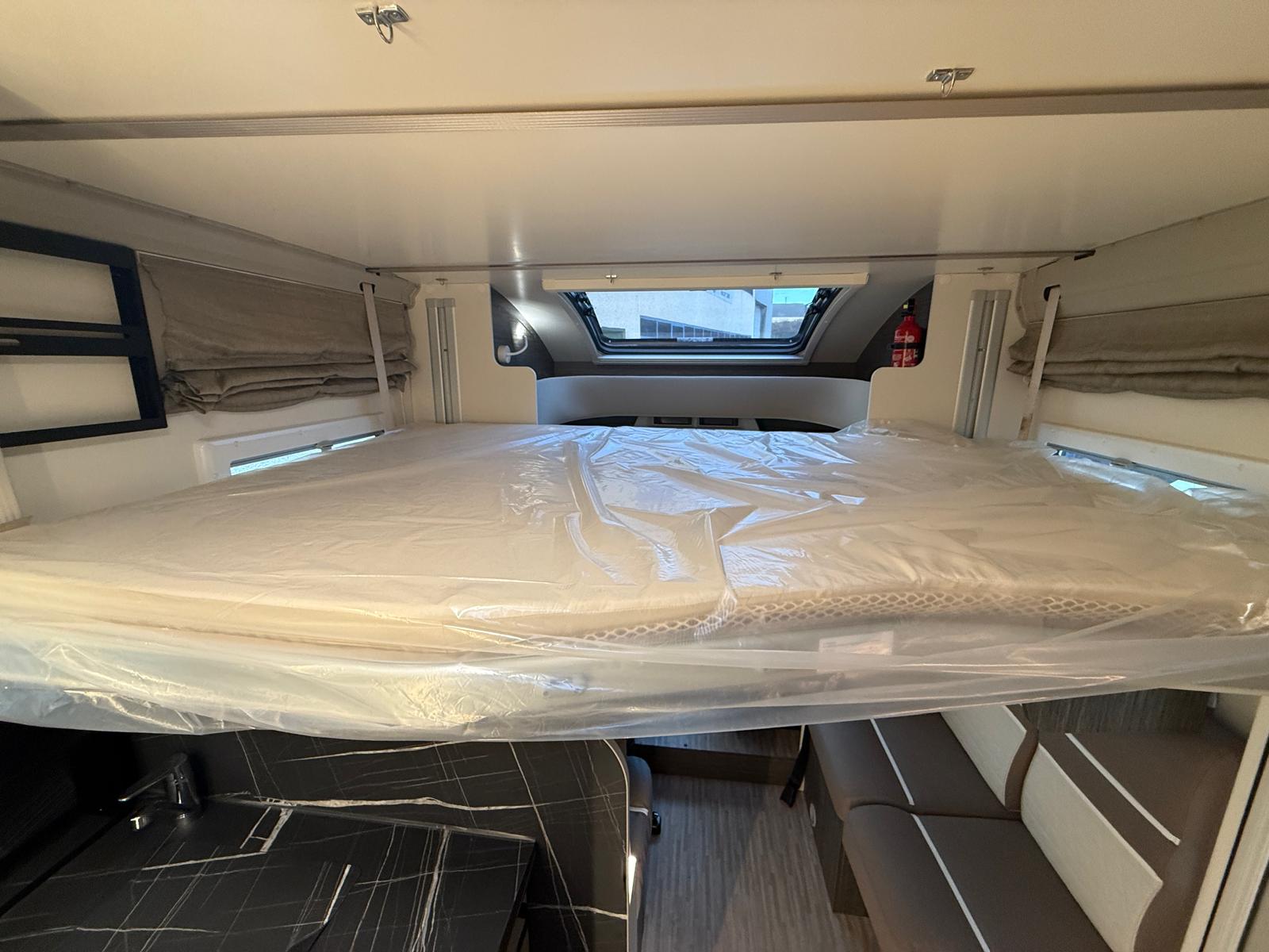 Autocaravana perfilada McLouis MC4 860 de 4 plazas de 6.99 m de largo. Año modelo 2026. Perfilada con cama basculante de menos de 7 metros de largo con cama doble trasera transversal, aseo con ducha integrada y amplio comedor con sofá angular y mesa central que se puede mover y girar 360.