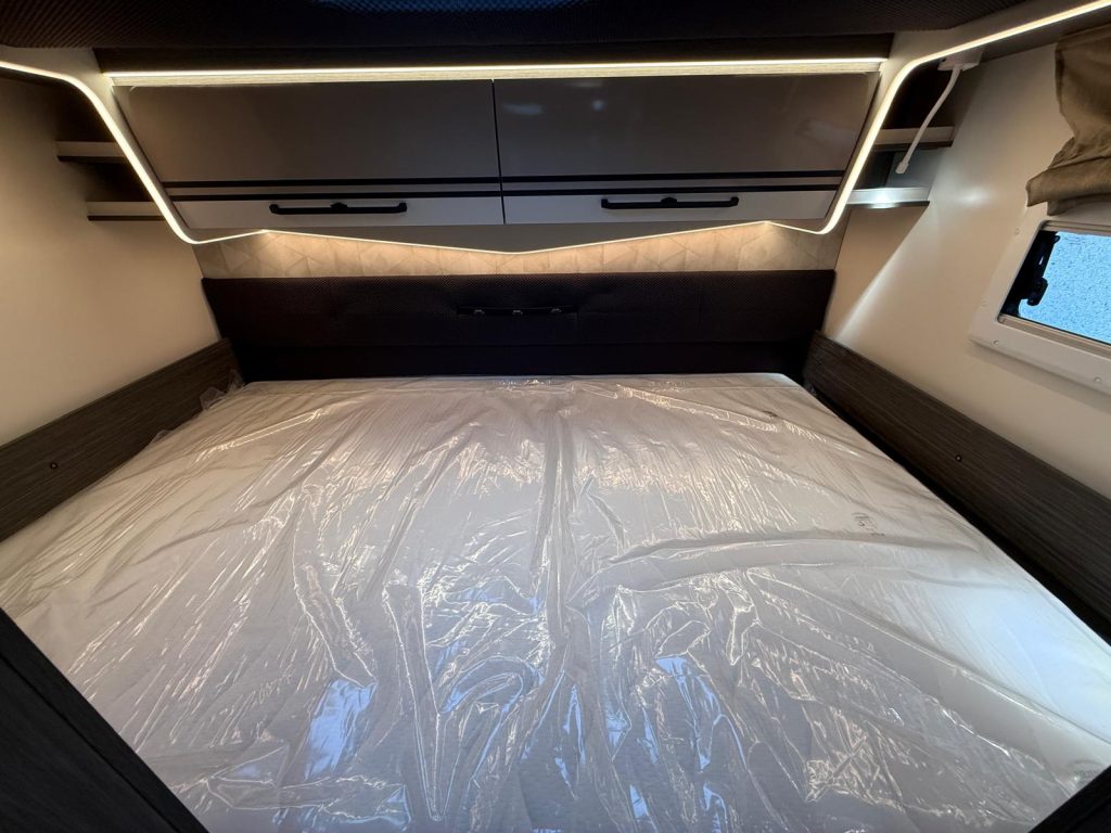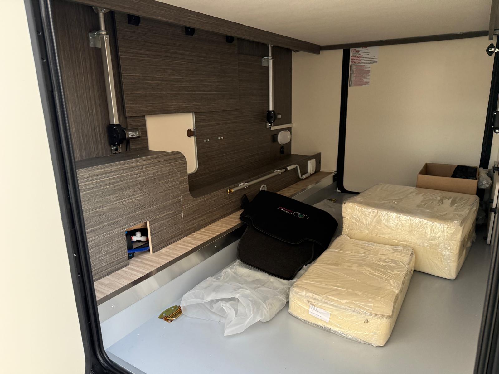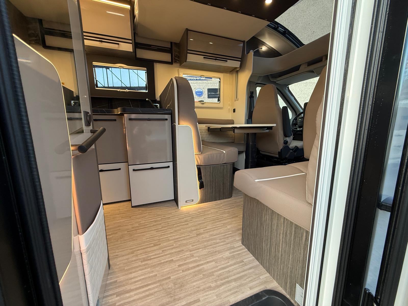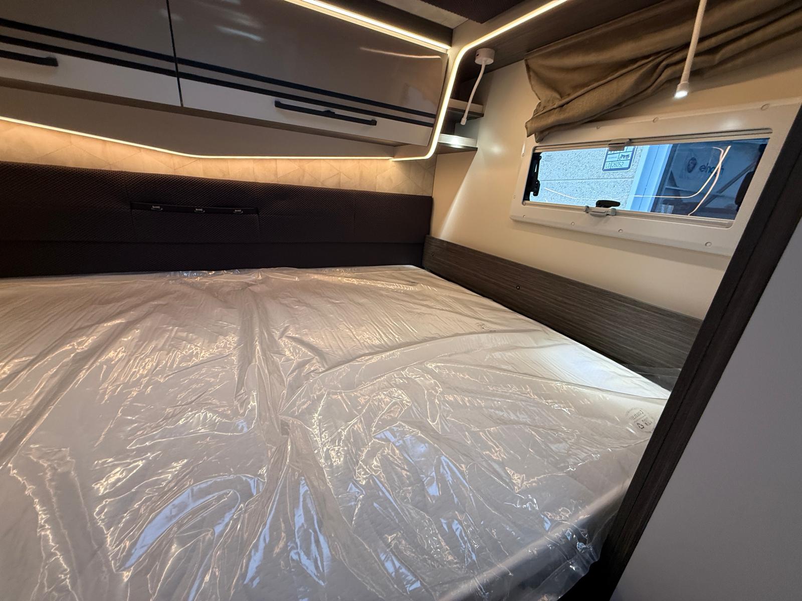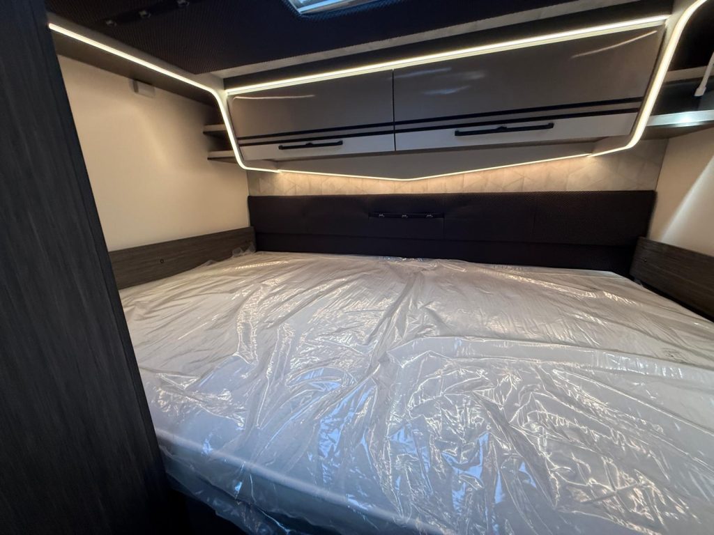 Autocaravana perfilada McLouis MC4 860 de 4 plazas de 6.99 m de largo. Año modelo 2026. Perfilada con cama basculante de menos de 7 metros de largo con cama doble trasera transversal, aseo con ducha integrada y amplio comedor con sofá angular y mesa central que se puede mover y girar 360.