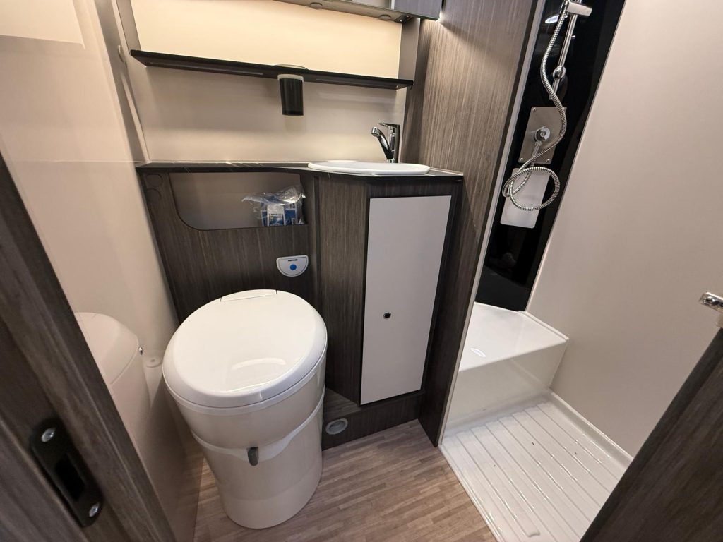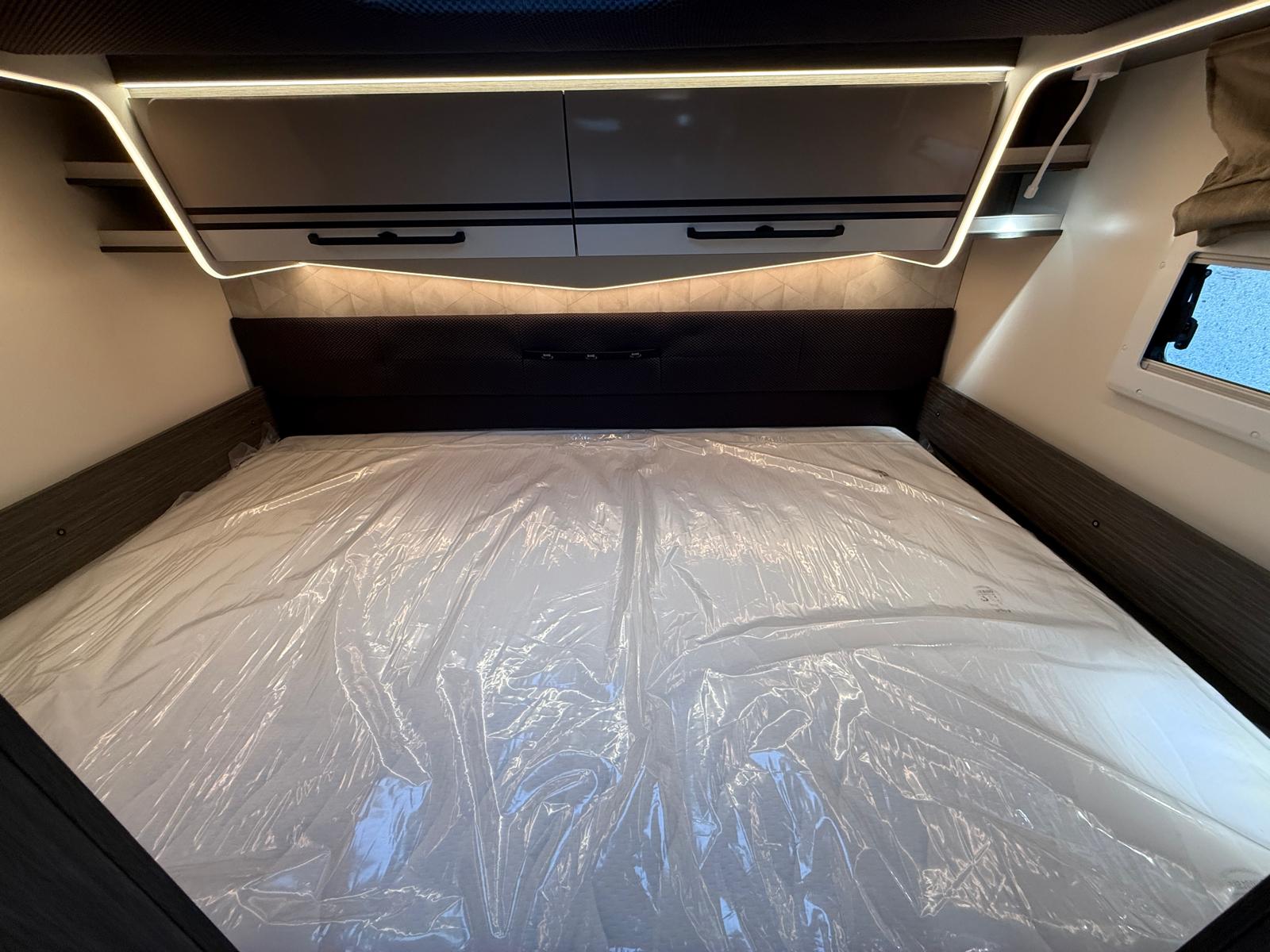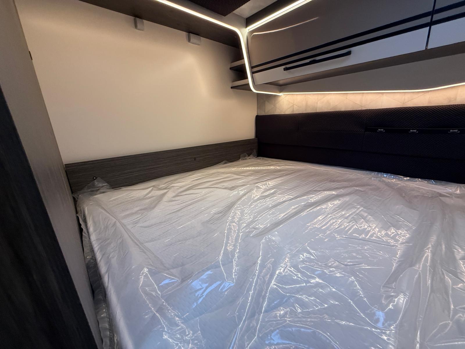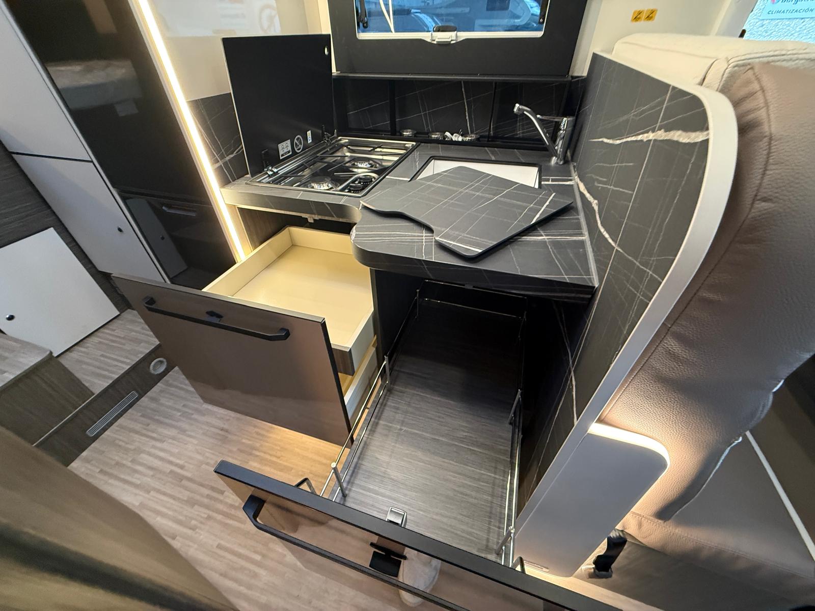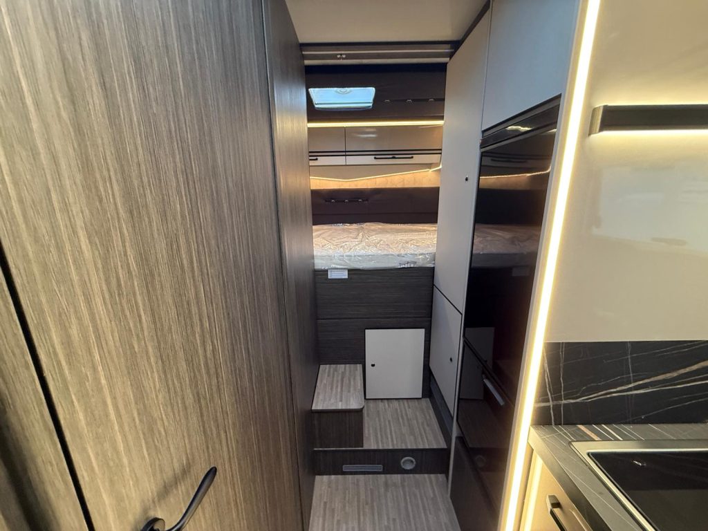 Autocaravana perfilada McLouis MC4 860 de 4 plazas de 6.99 m de largo. Año modelo 2026. Perfilada con cama basculante de menos de 7 metros de largo con cama doble trasera transversal, aseo con ducha integrada y amplio comedor con sofá angular y mesa central que se puede mover y girar 360.