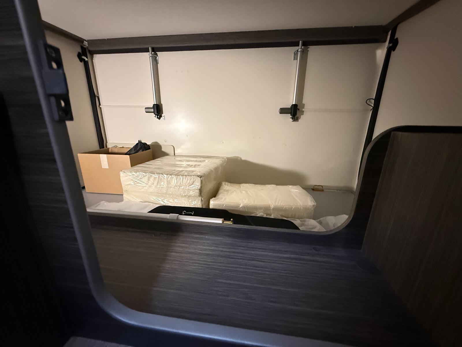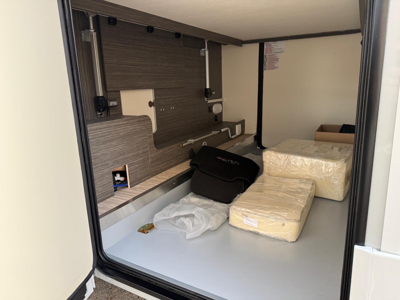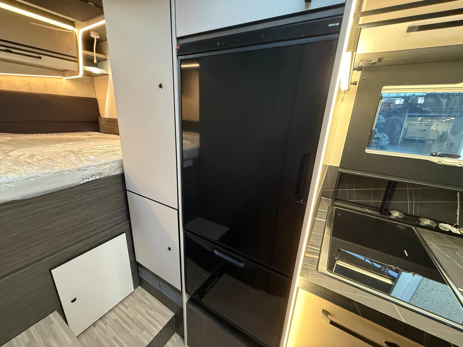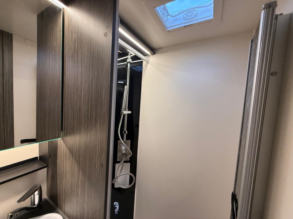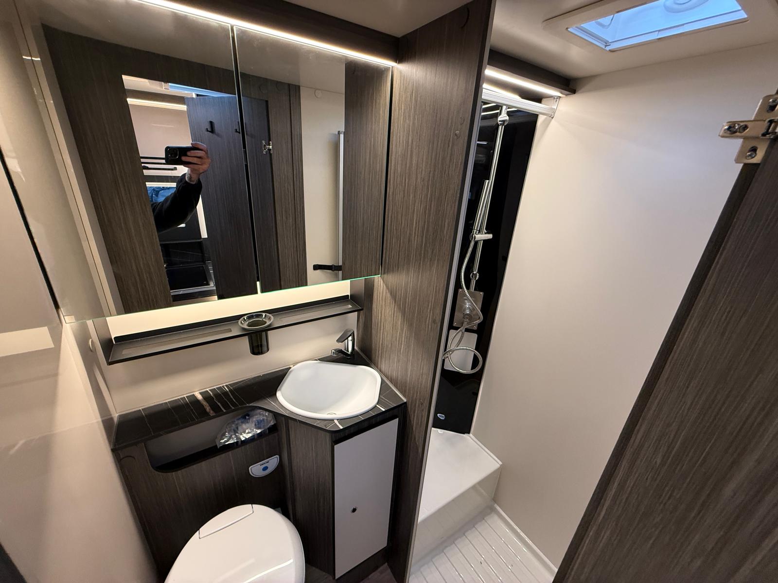 Autocaravana perfilada McLouis MC4 860 de 4 plazas de 6.99 m de largo. Año modelo 2026. Perfilada con cama basculante de menos de 7 metros de largo con cama doble trasera transversal, aseo con ducha integrada y amplio comedor con sofá angular y mesa central que se puede mover y girar 360.