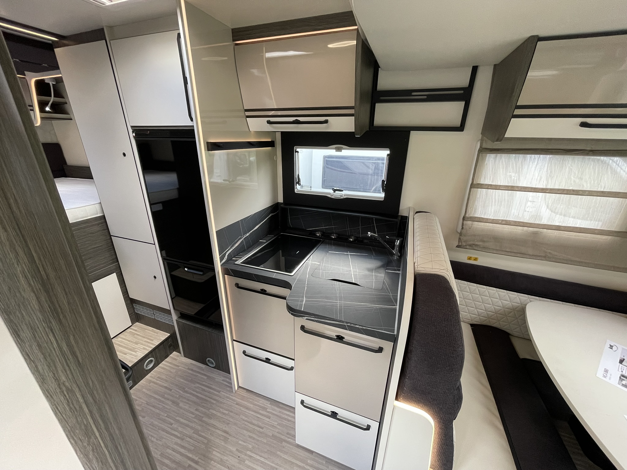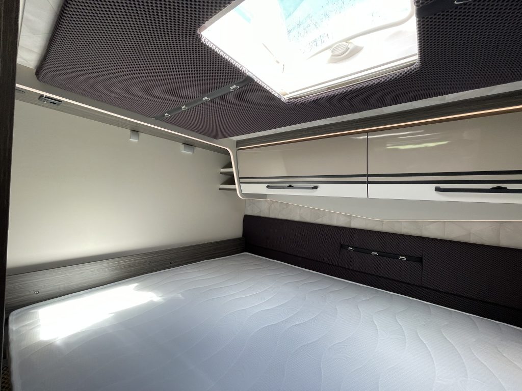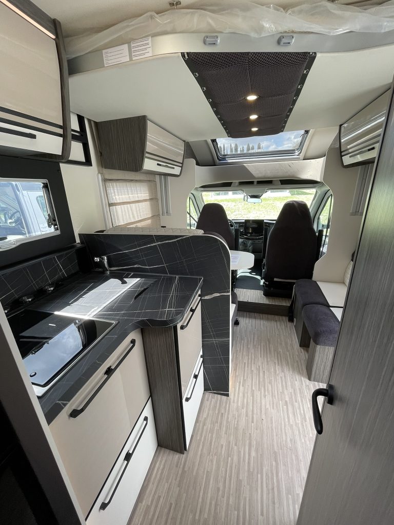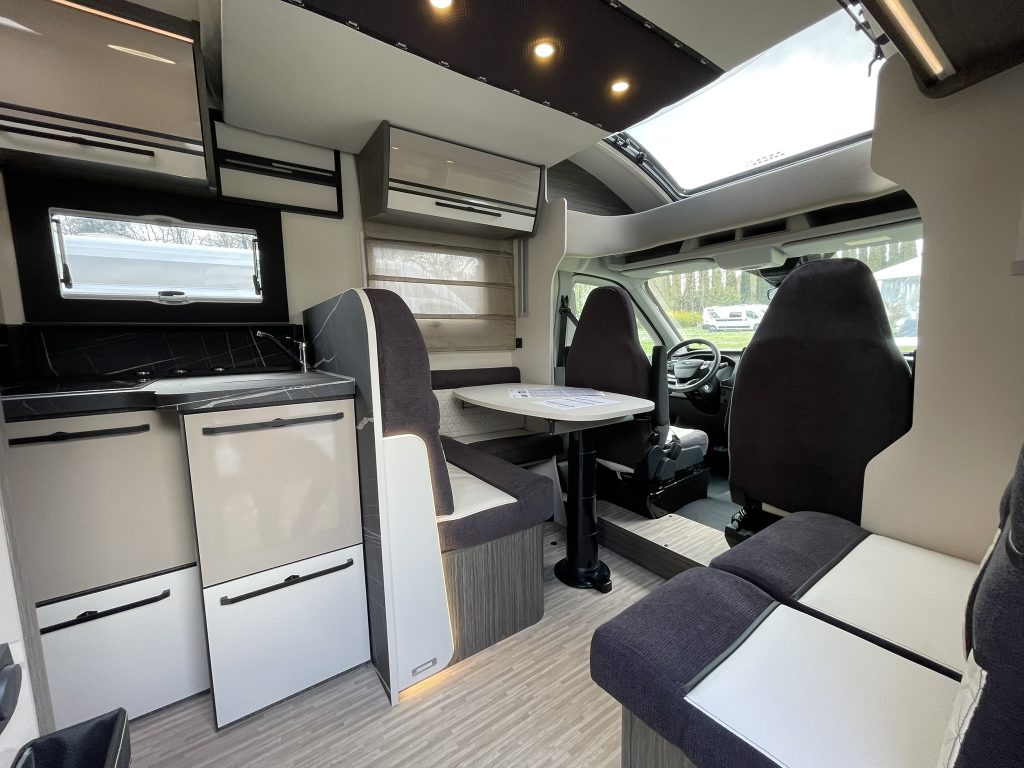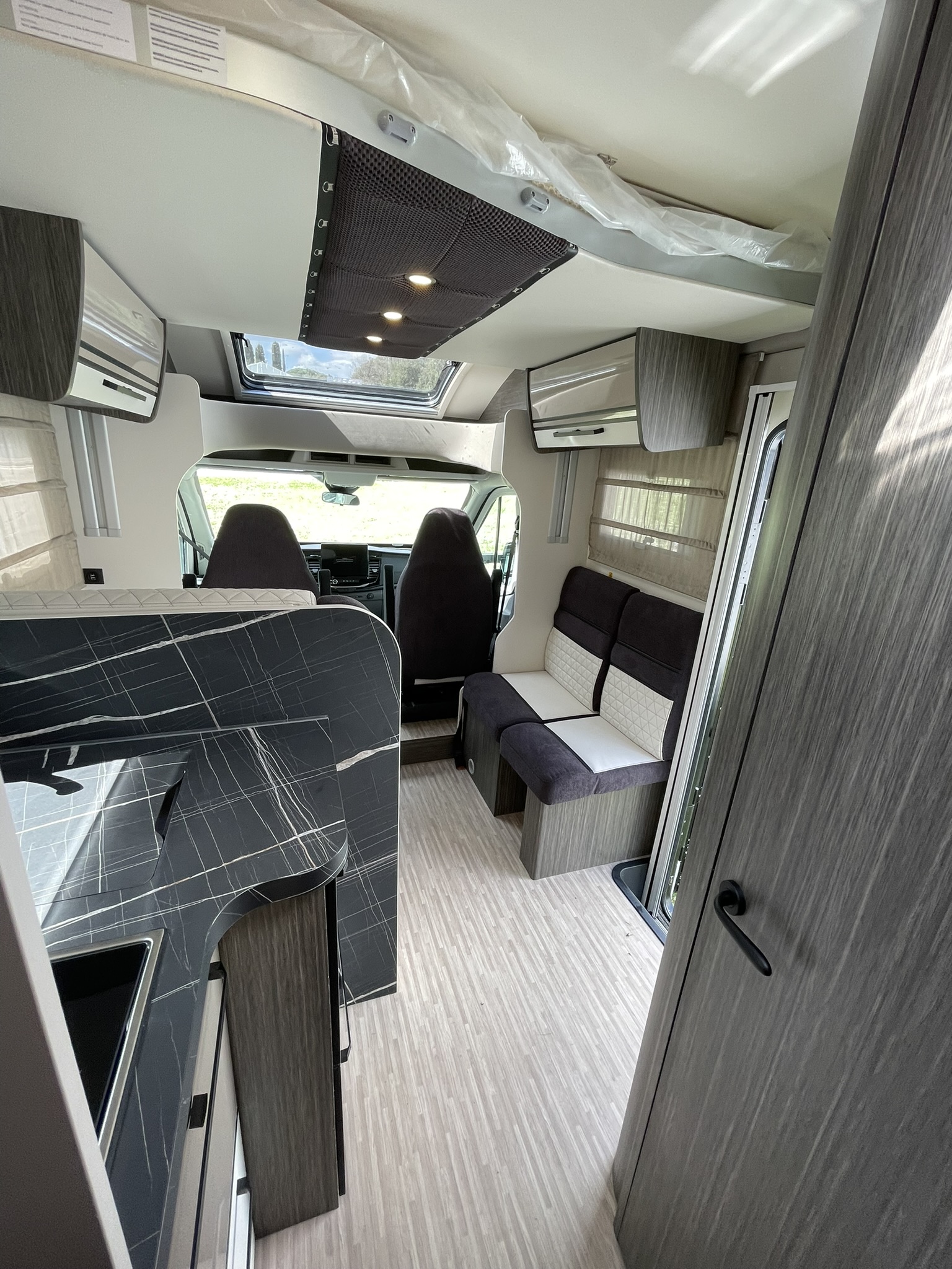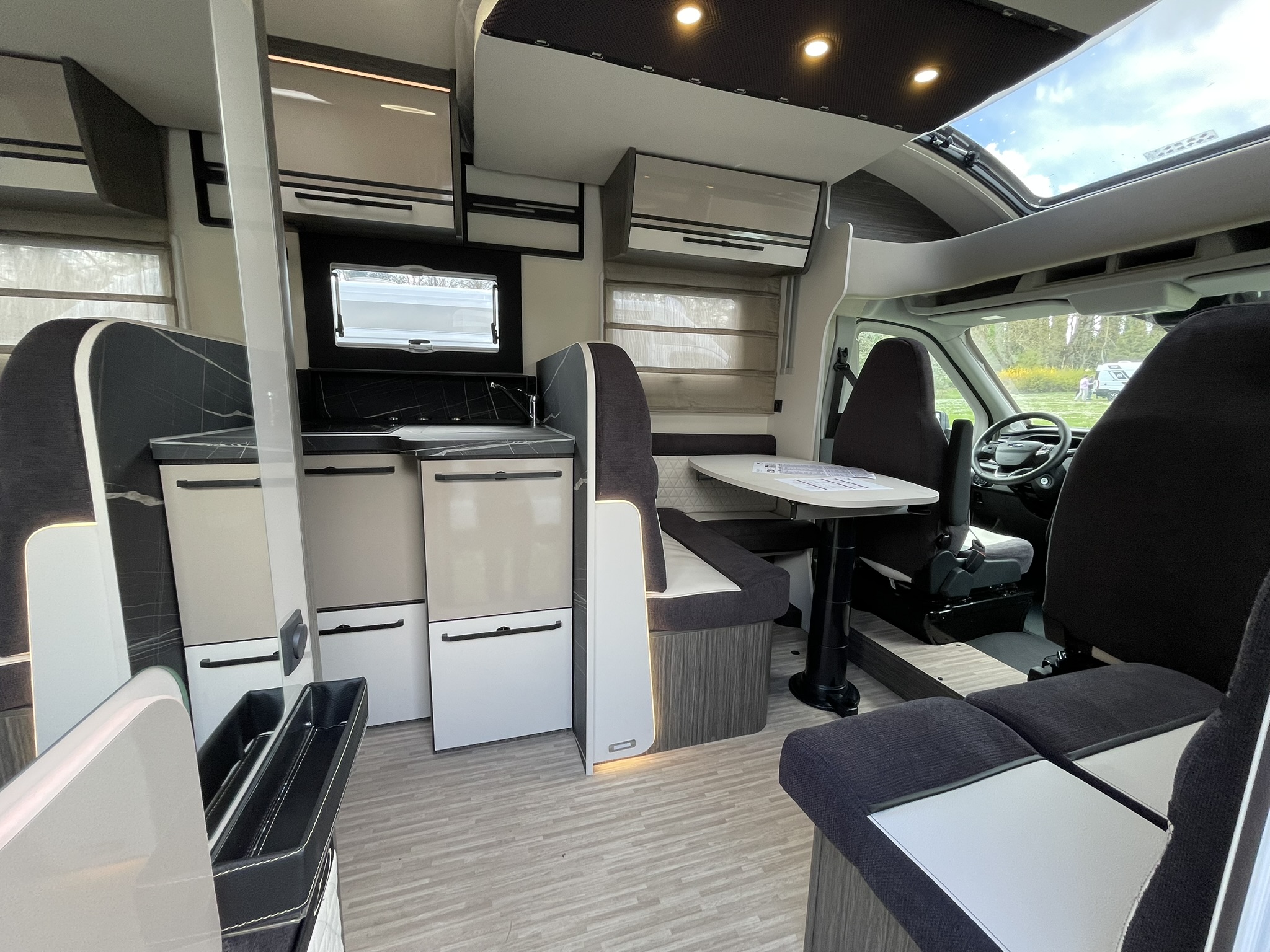 Autocaravana perfilada McLouis MC4 881 de 4 plazas de 7.45 m de largo. Año modelo 2026. Perfilada con cama basculante de menos de 7 metros de largo con cama doble trasera transversal, aseo con ducha integrada y amplio comedor con sofá angular y mesa central que se puede mover y girar 360.