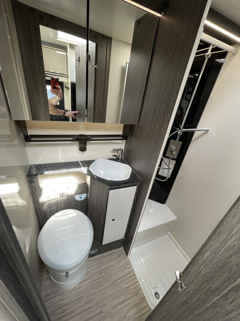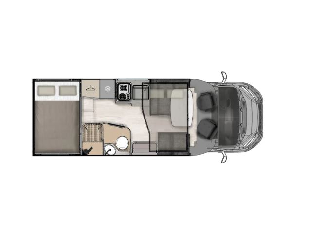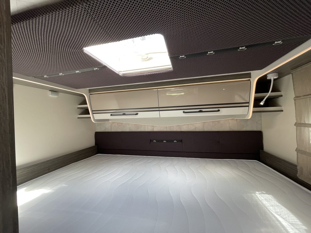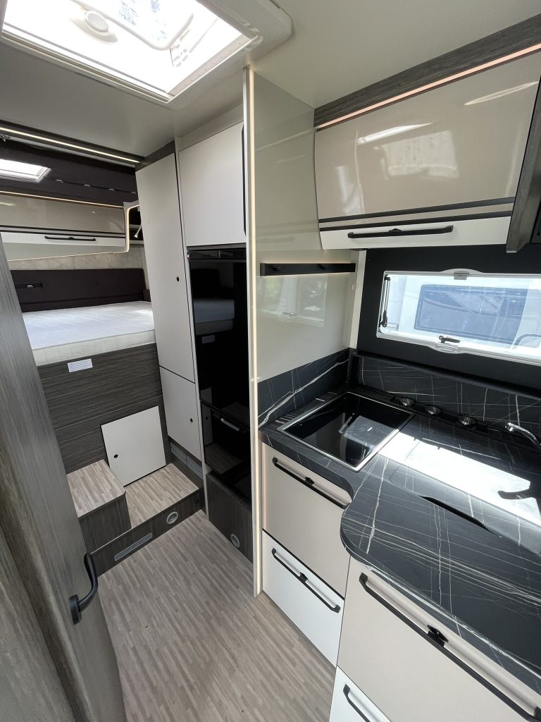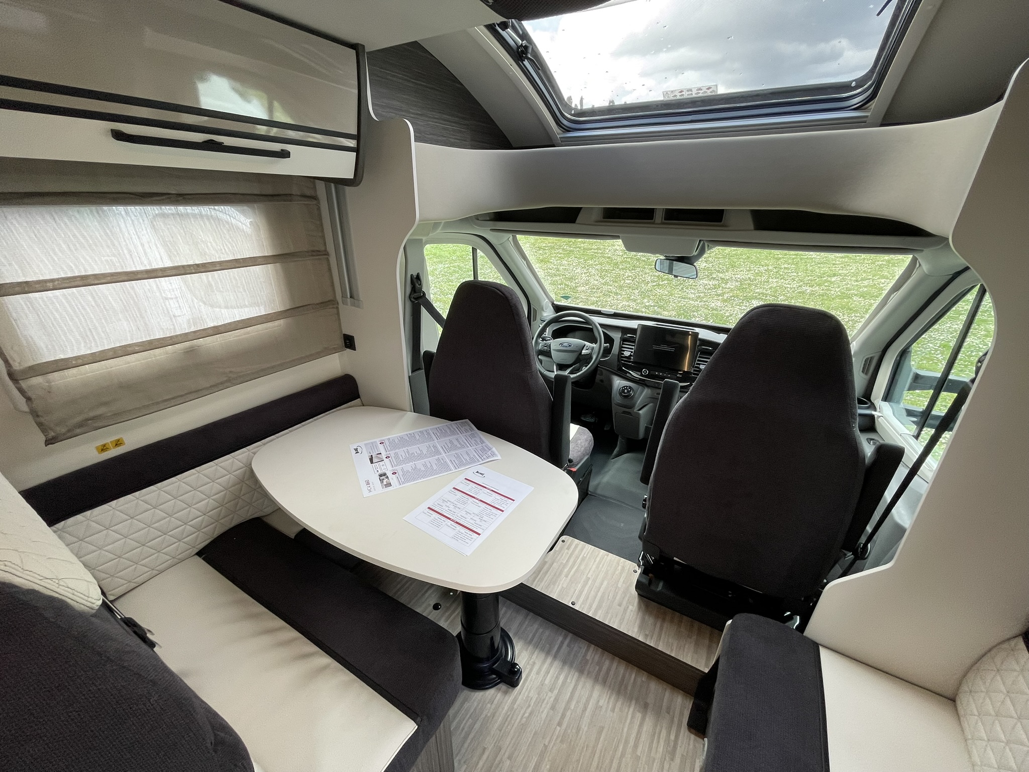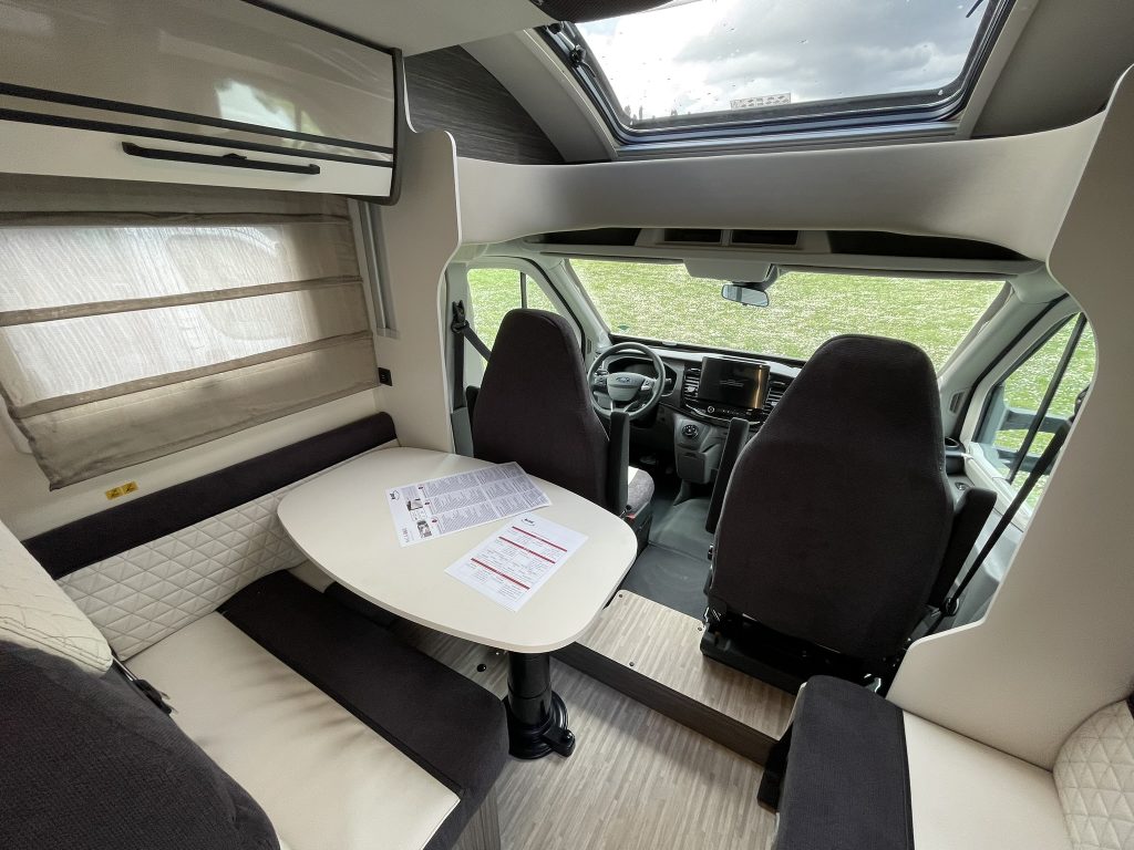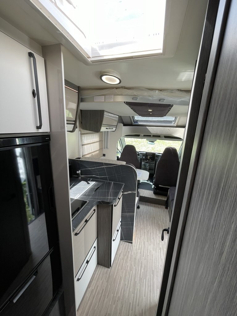 Autocaravana perfilada McLouis MC4 881 de 4 plazas de 7.45 m de largo. Año modelo 2026. Perfilada con cama basculante de menos de 7 metros de largo con cama doble trasera transversal, aseo con ducha integrada y amplio comedor con sofá angular y mesa central que se puede mover y girar 360.