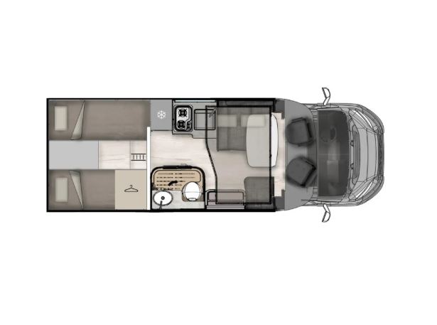 Autocaravana perfilada McLouis MC4 865 de 5 plazas de 6.99 m de largo. Año modelo 2026. Perfilada con cama basculante de menos de 7 metros de longitud con dos camas gemelas, con una de las 2 camas de 2 metros. Con puerta de entrada XL de dos puntos con cierre centralizado, ventanilla fija y mosquitera, baño de volumen variable y camas gemelas convertibles en maxi cama doble.