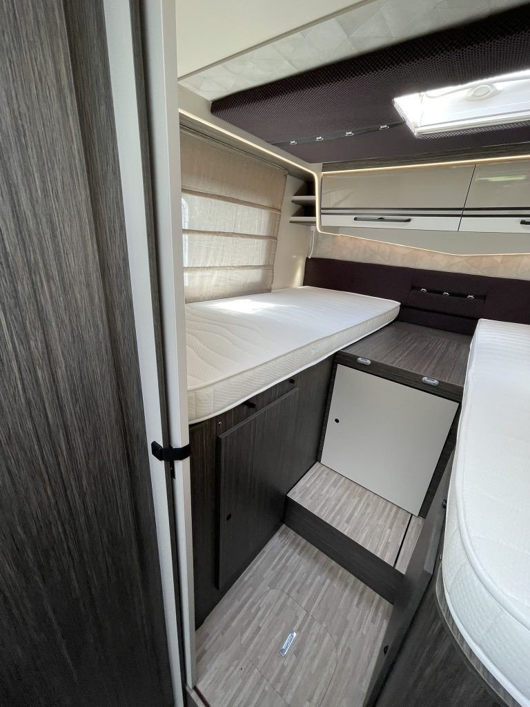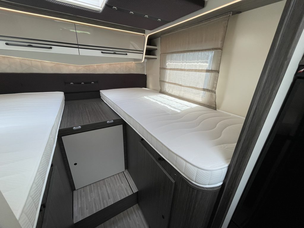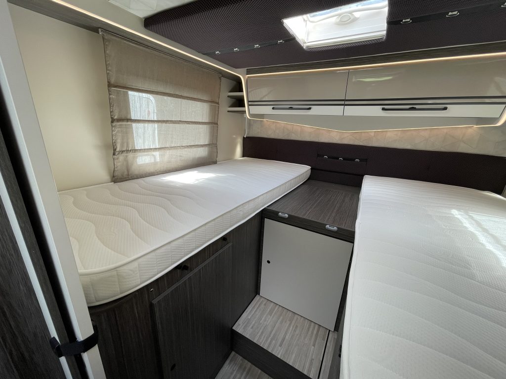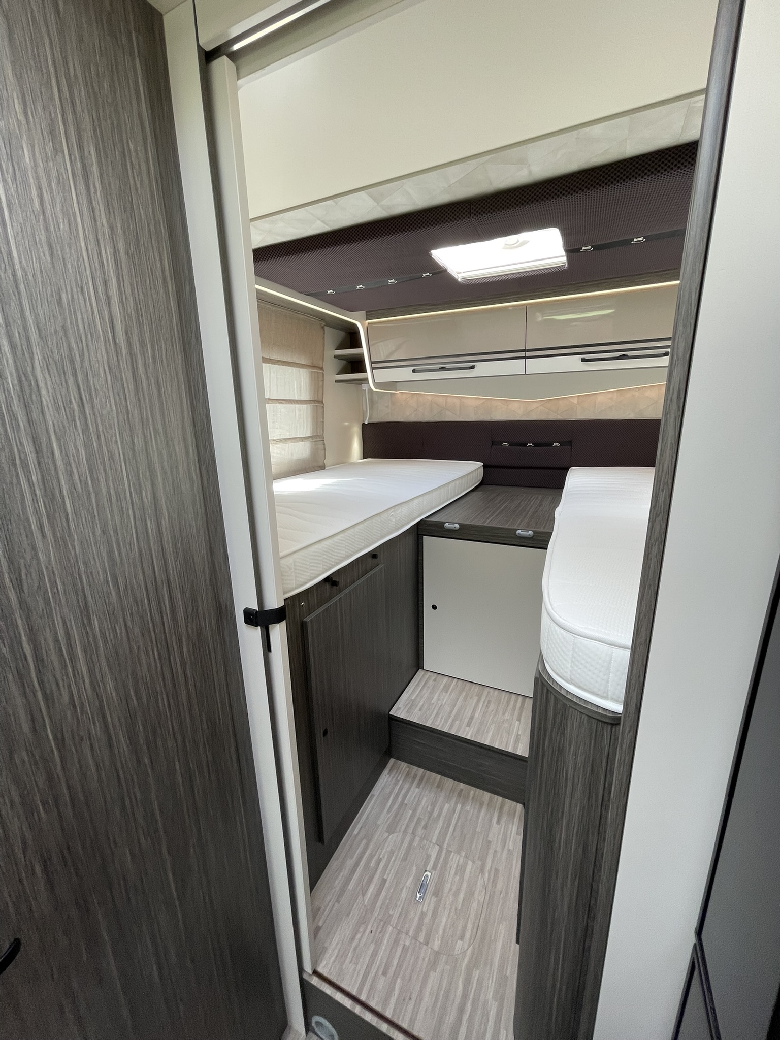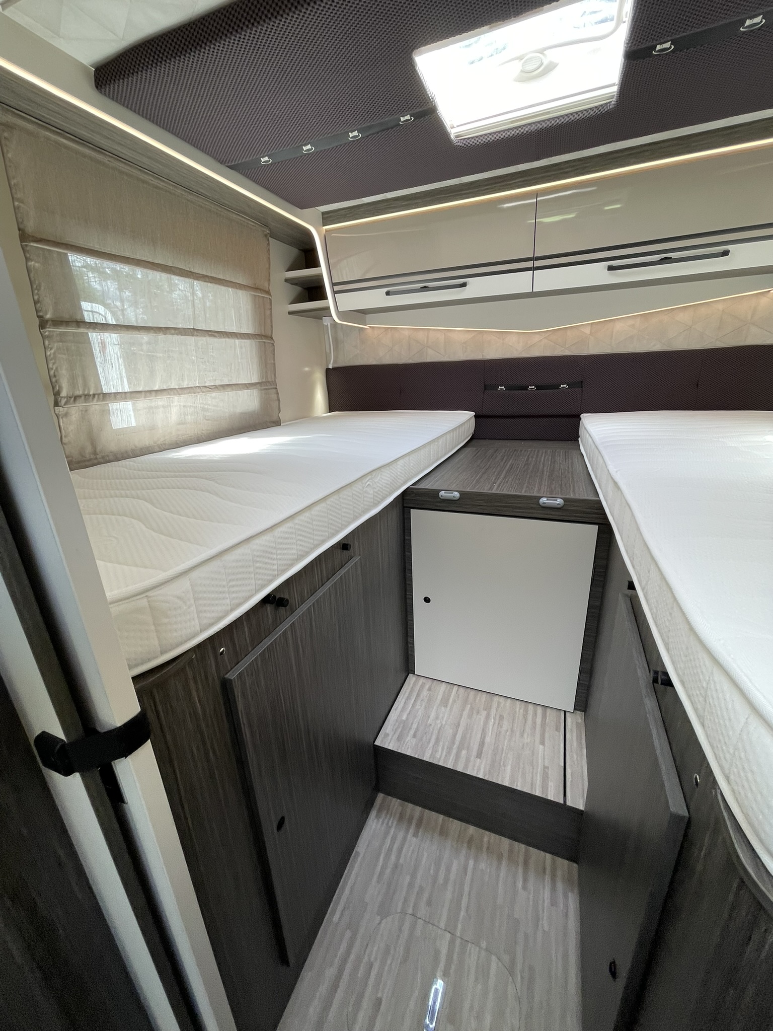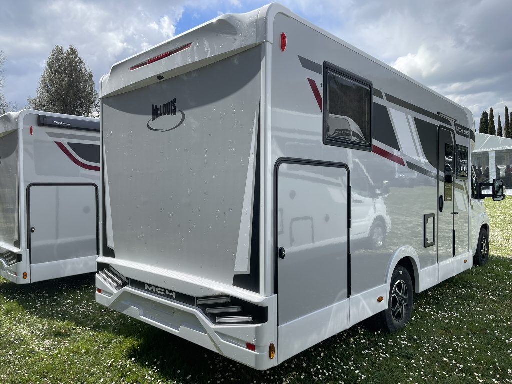 Autocaravana perfilada McLouis MC4 865 de 5 plazas de 6.99 m de largo. Año modelo 2026. Perfilada con cama basculante de menos de 7 metros de longitud con dos camas gemelas, con una de las 2 camas de 2 metros. Con puerta de entrada XL de dos puntos con cierre centralizado, ventanilla fija y mosquitera, baño de volumen variable y camas gemelas convertibles en maxi cama doble.