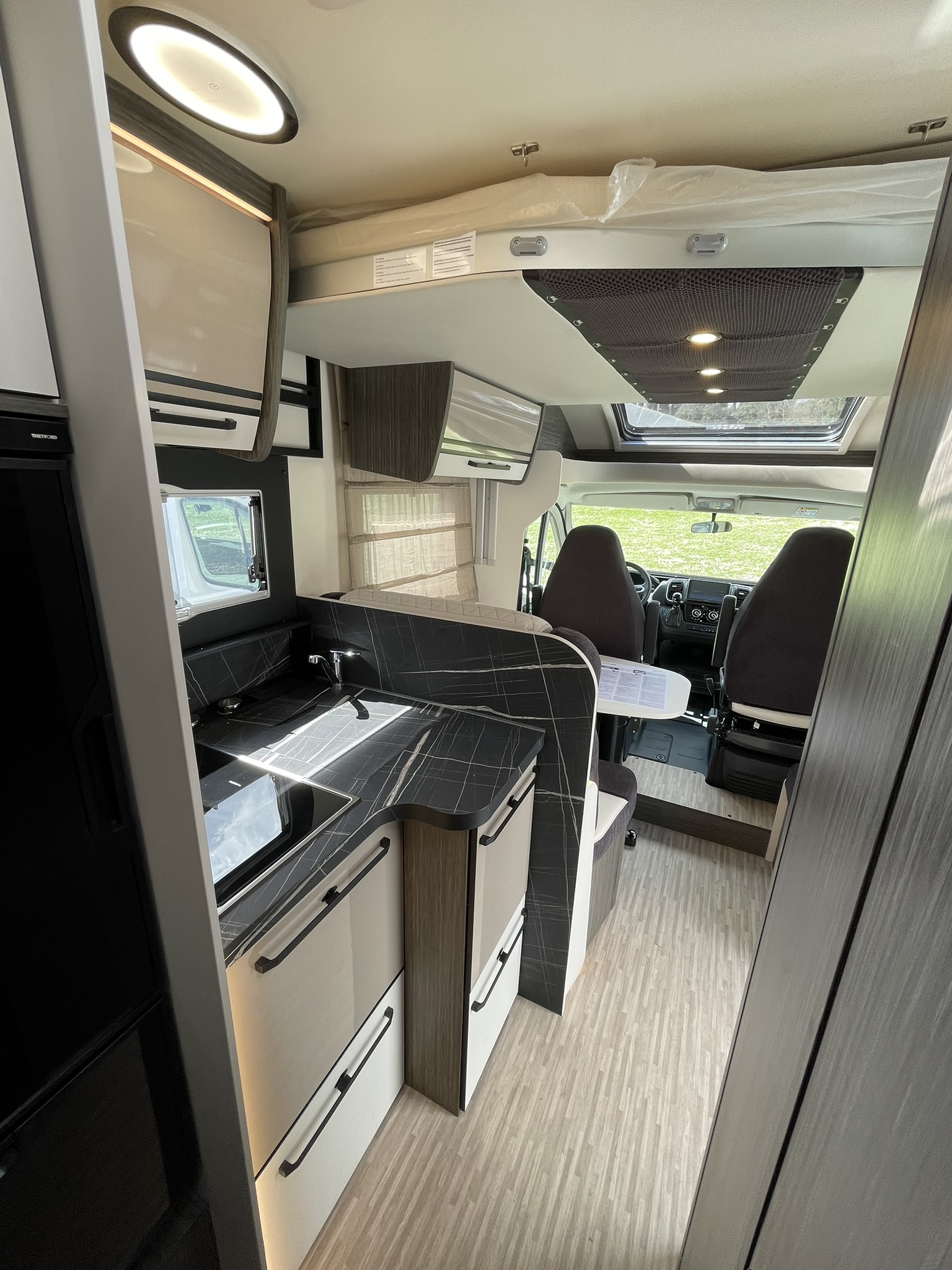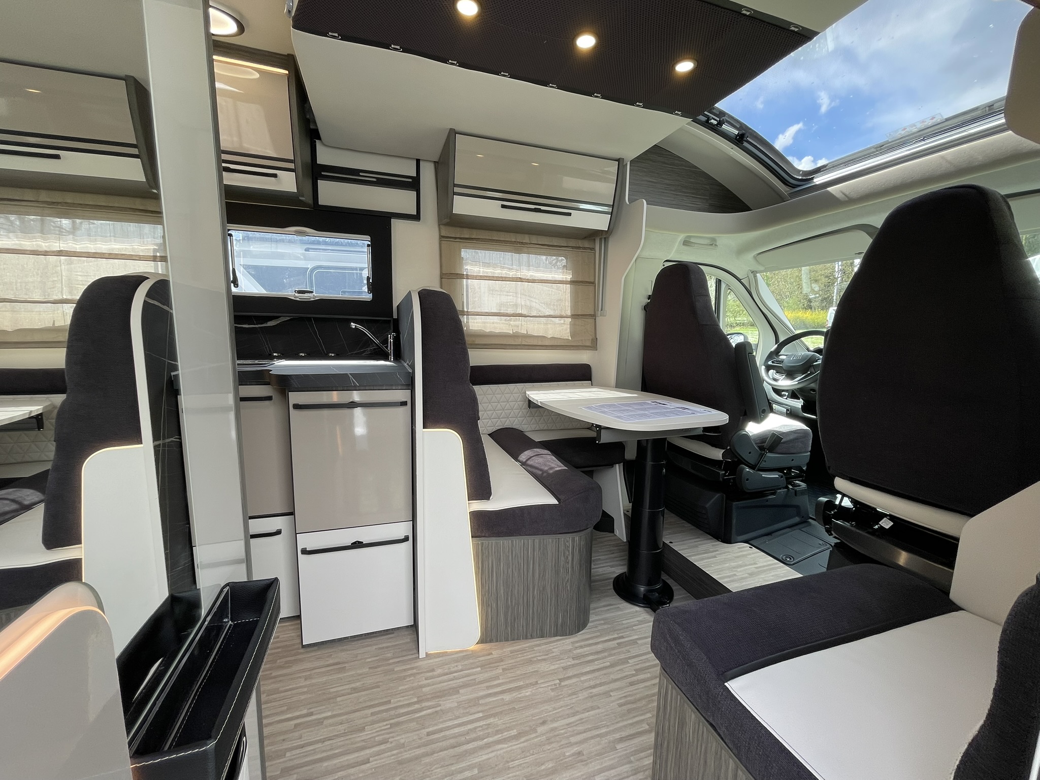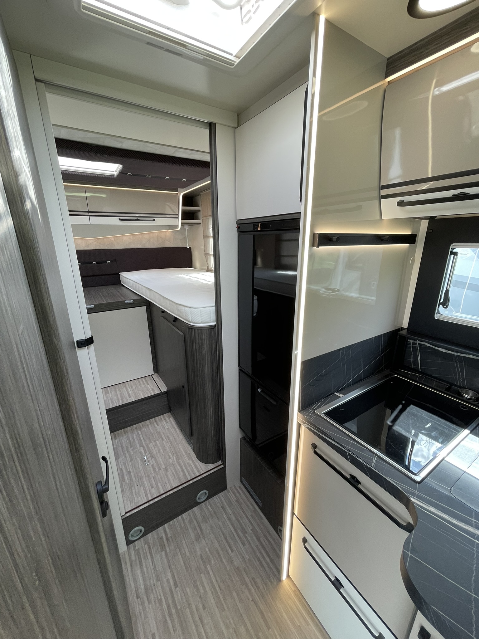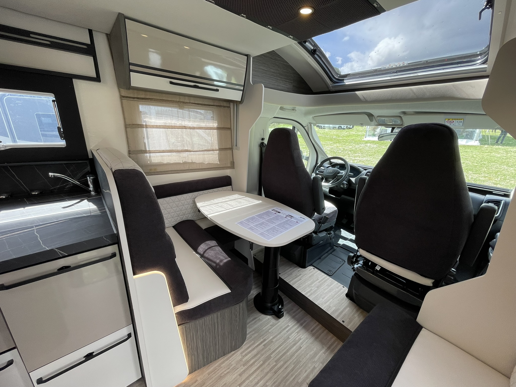 Autocaravana perfilada McLouis MC4 865 de 5 plazas de 6.99 m de largo. Año modelo 2026. Perfilada con cama basculante de menos de 7 metros de longitud con dos camas gemelas, con una de las 2 camas de 2 metros. Con puerta de entrada XL de dos puntos con cierre centralizado, ventanilla fija y mosquitera, baño de volumen variable y camas gemelas convertibles en maxi cama doble.