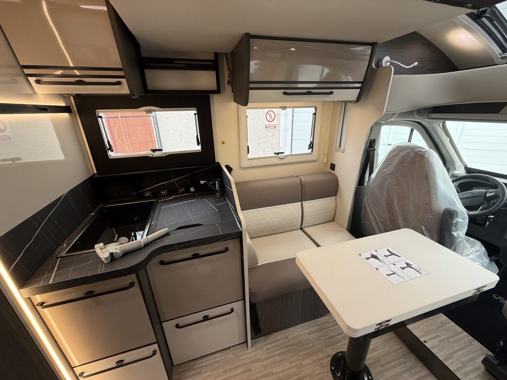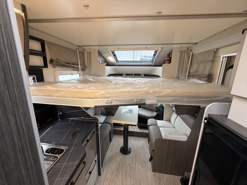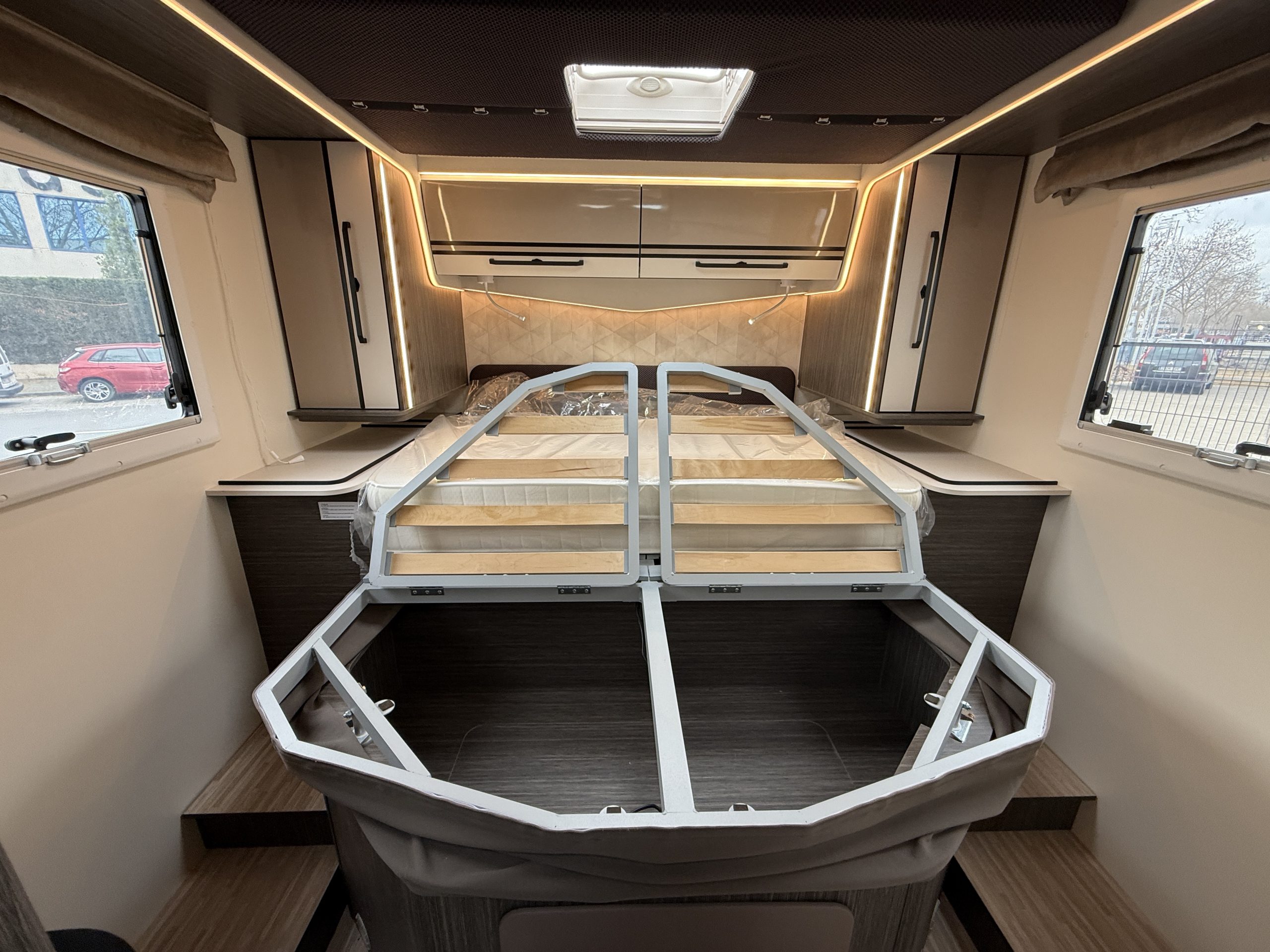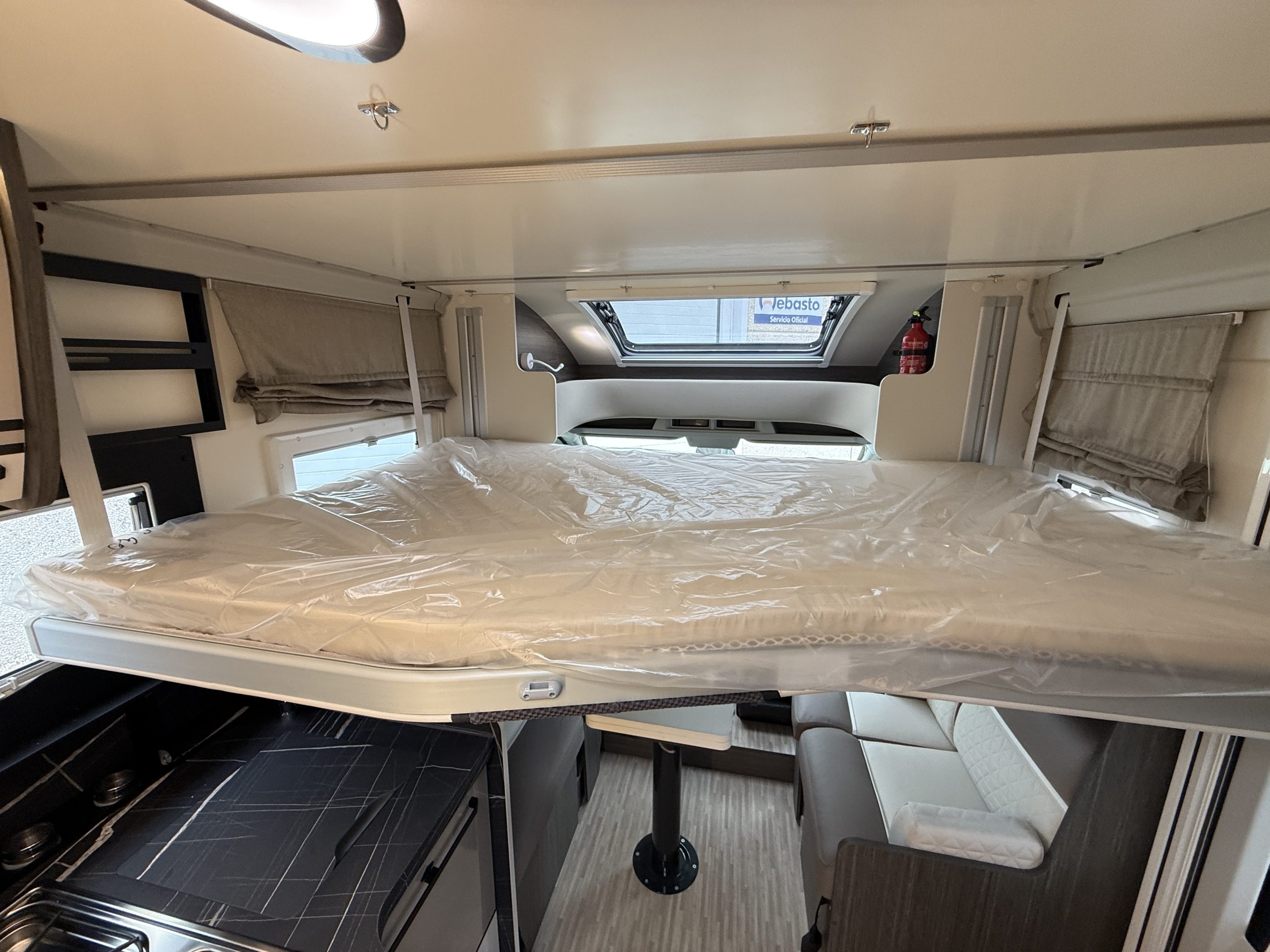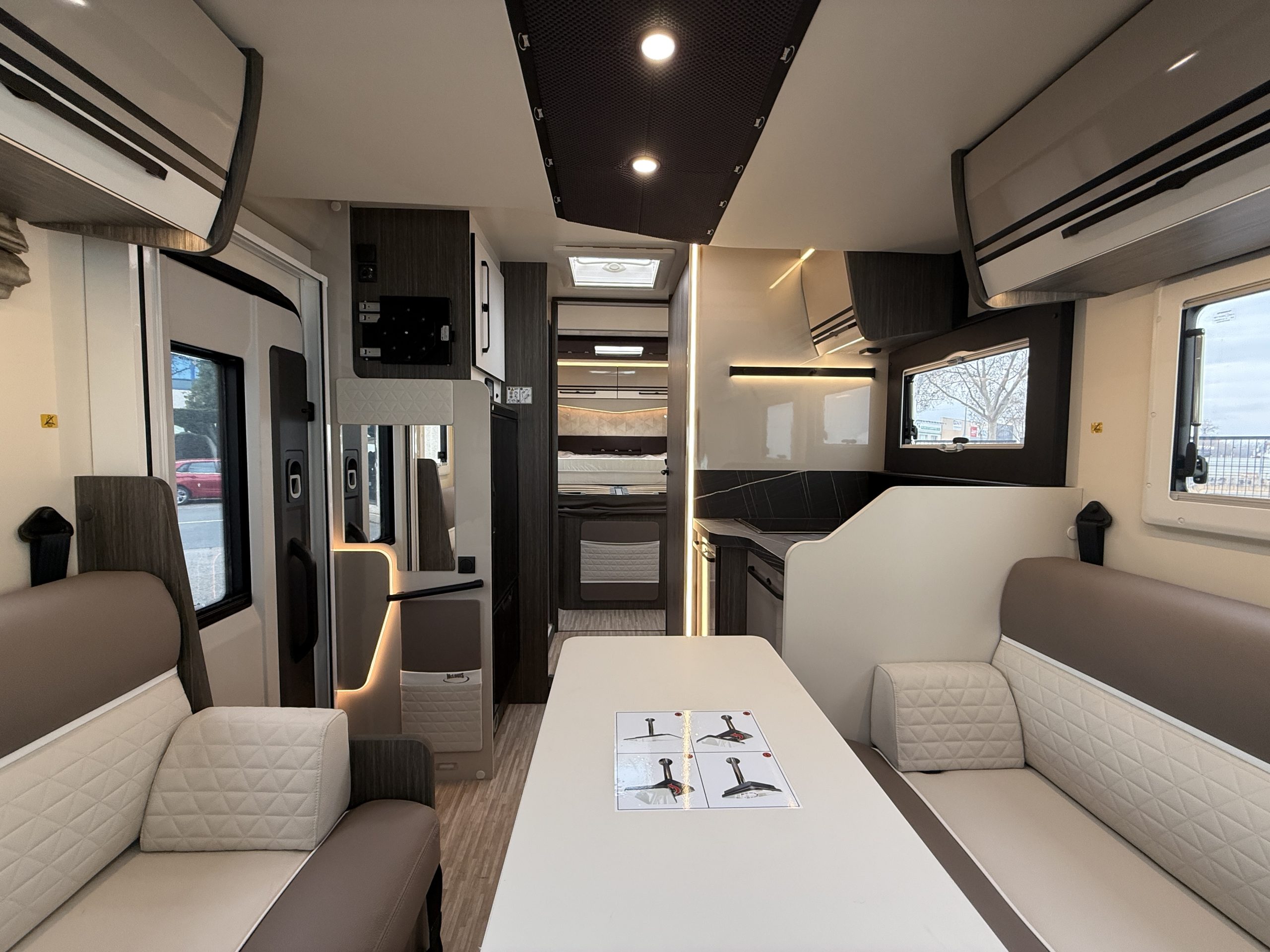 Autocaravana perfilada McLouis MC4 881 de 4 plazas de 7.45 m de largo. Año modelo 2026. Perfilada con cama plegable de 7,45 m de largo con salón face to face, mesa plegable giratoria 360°, cama central trasera y aseo con ducha separada.