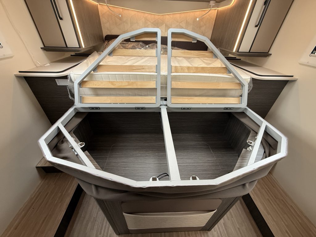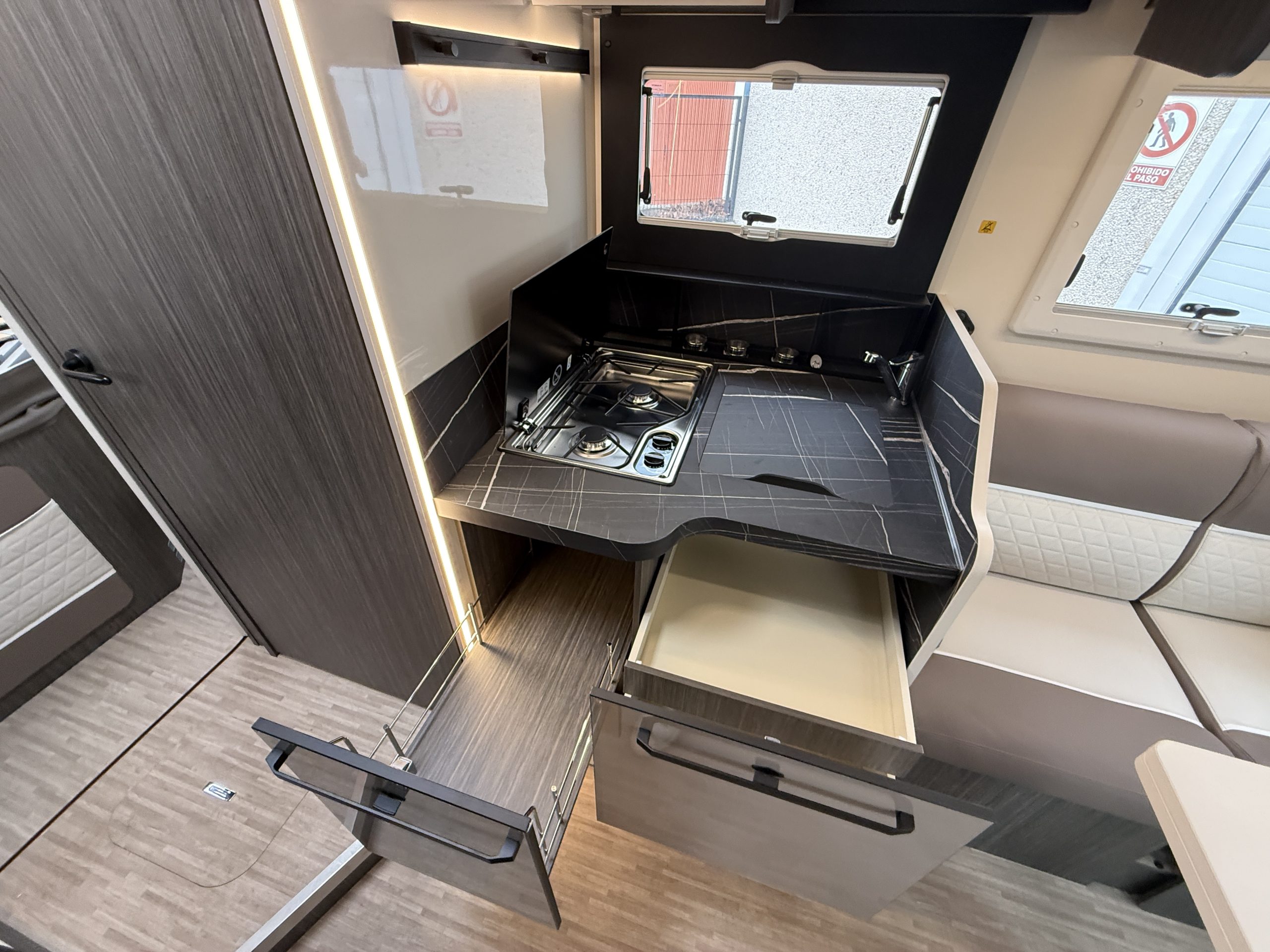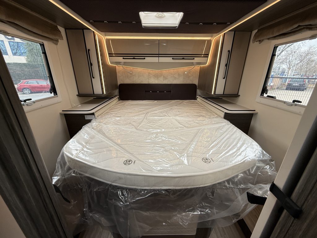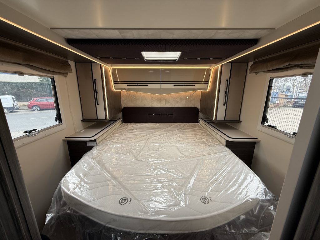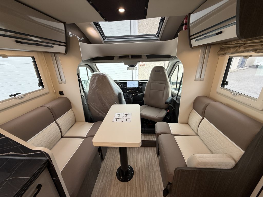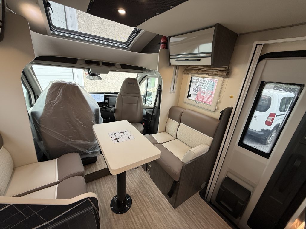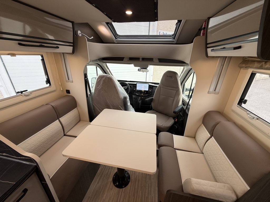 Autocaravana perfilada McLouis MC4 881 de 4 plazas de 7.45 m de largo. Año modelo 2026. Perfilada con cama plegable de 7,45 m de largo con salón face to face, mesa plegable giratoria 360°, cama central trasera y aseo con ducha separada.