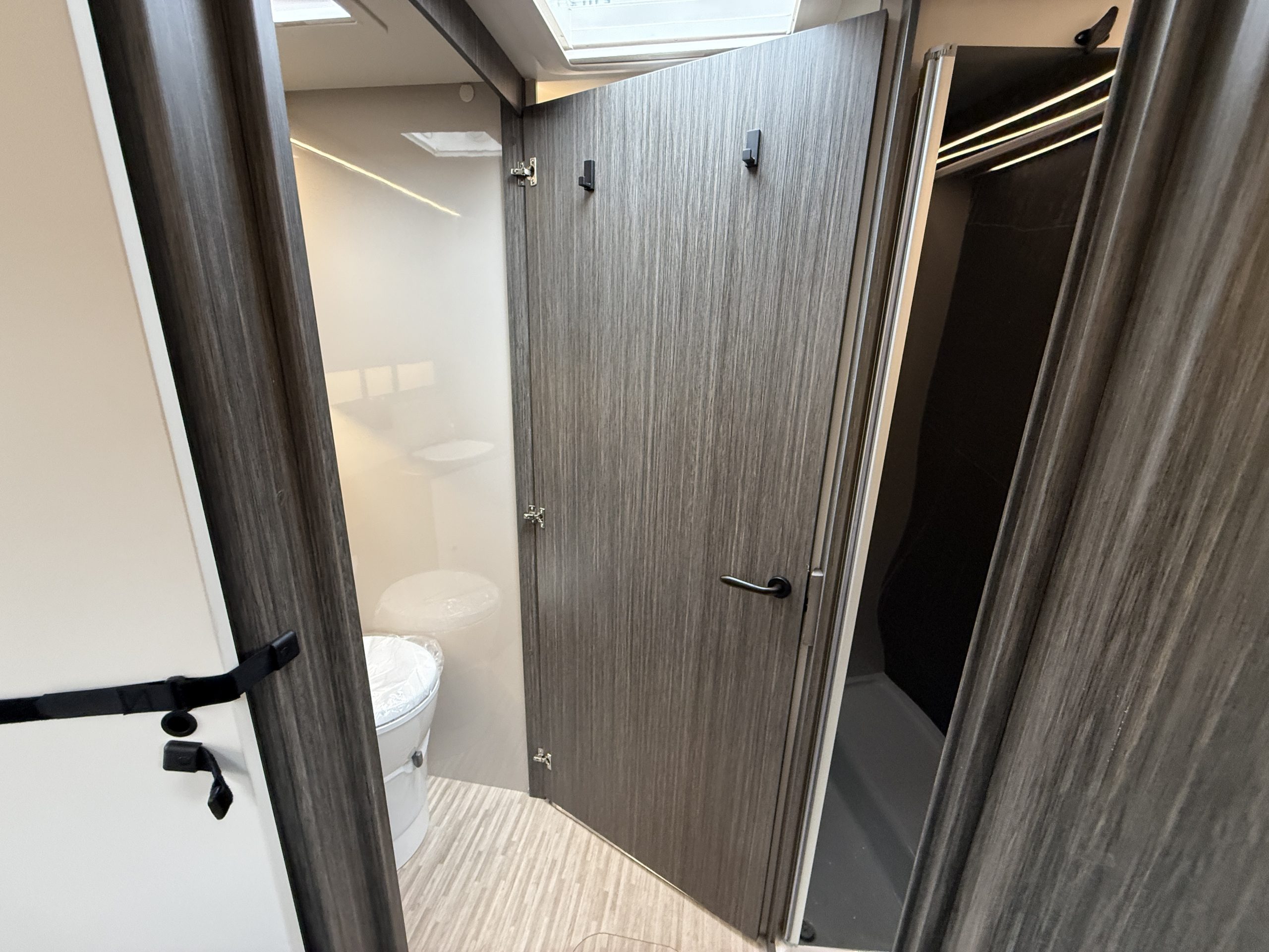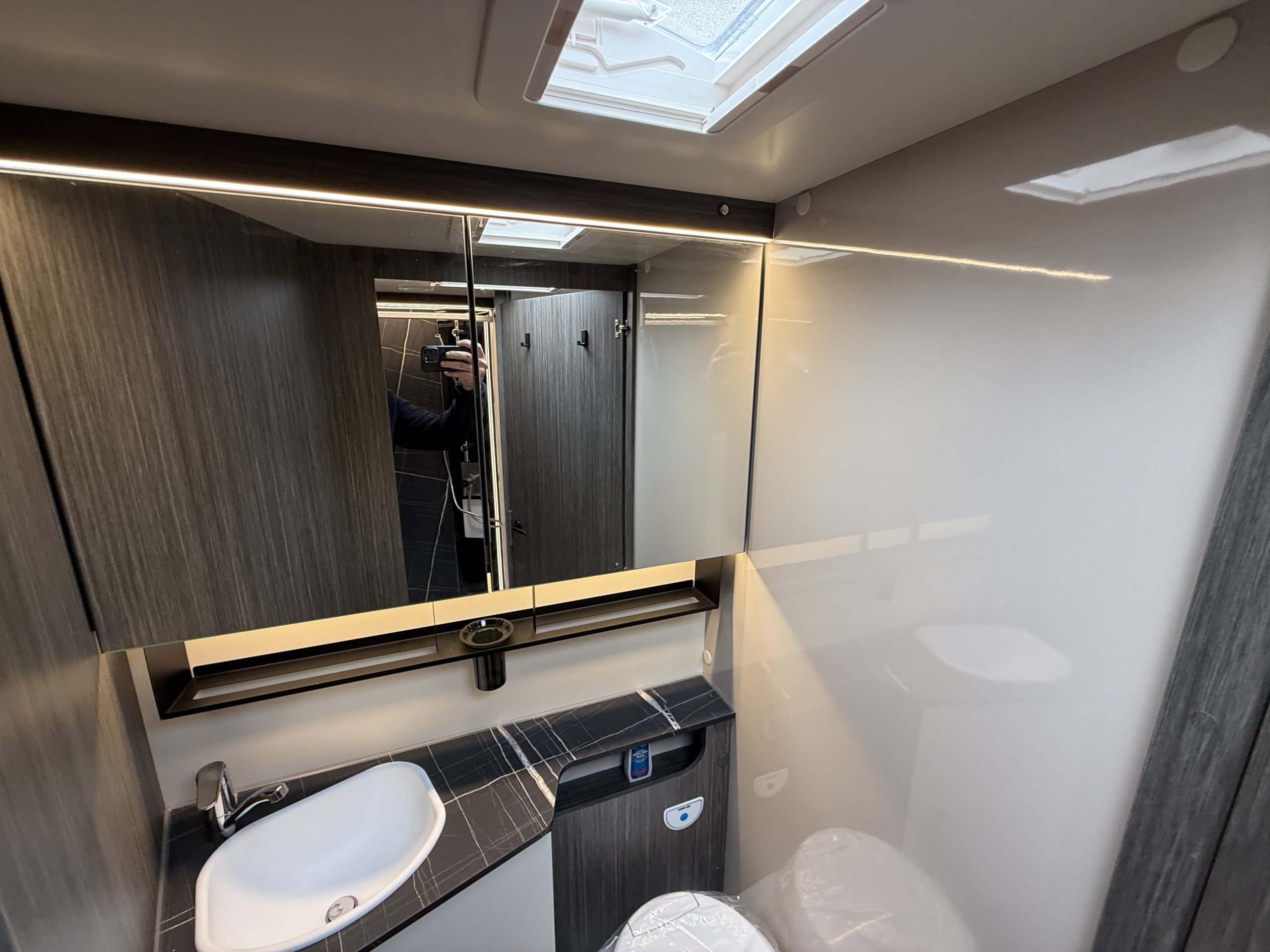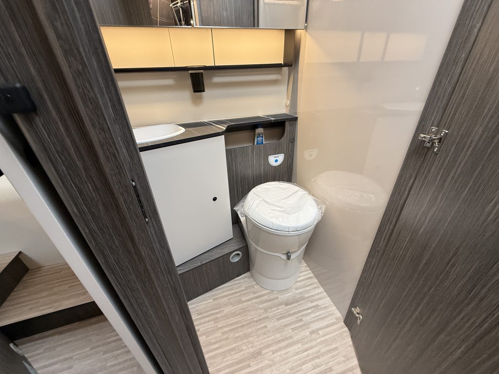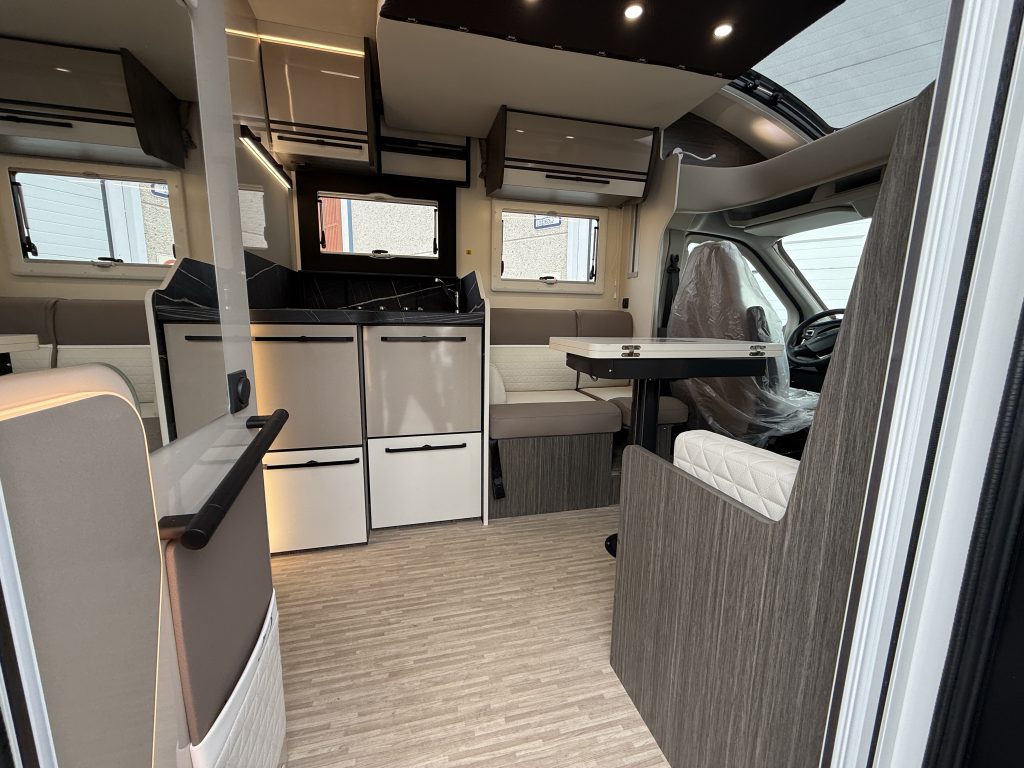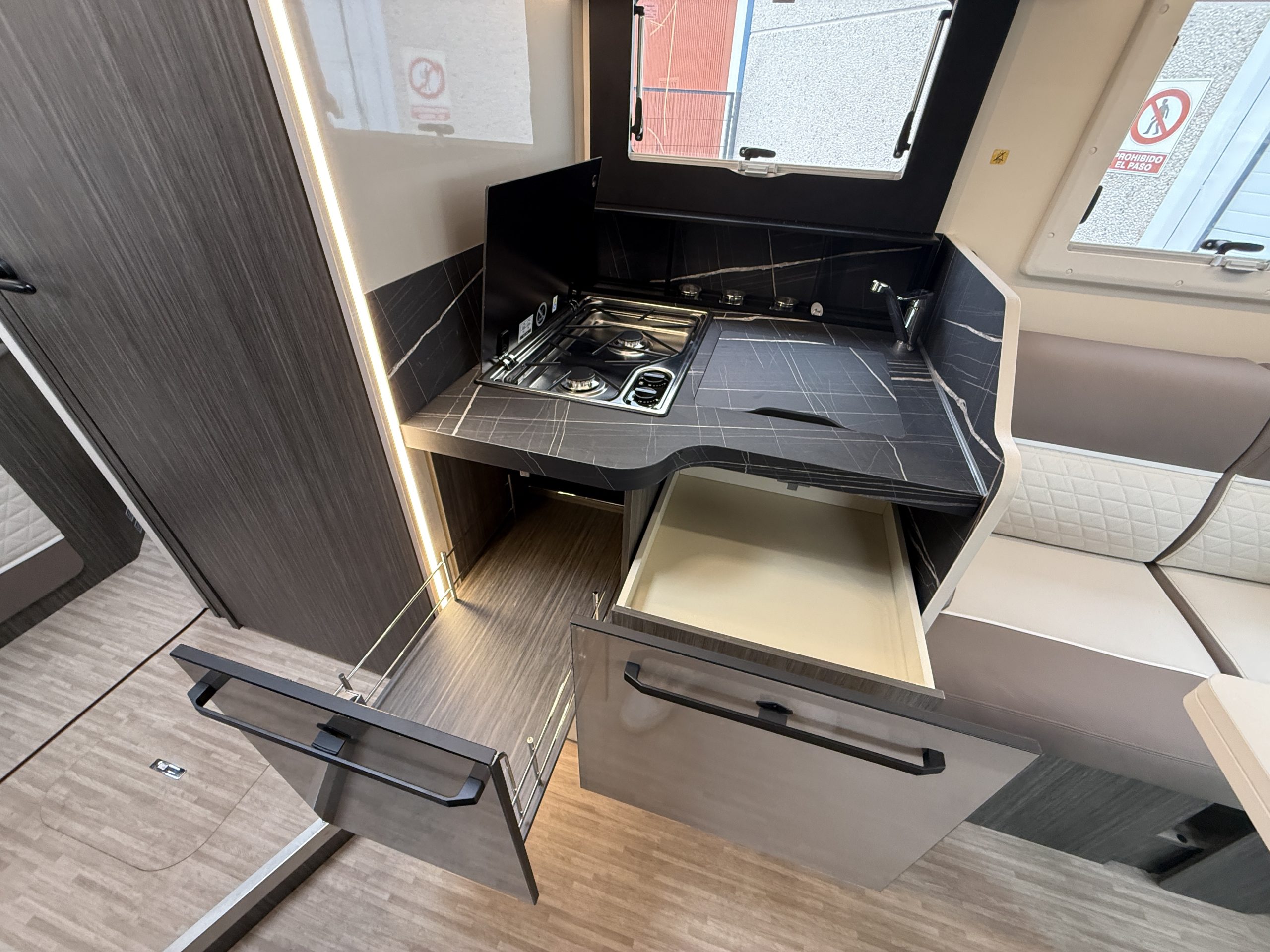 Autocaravana perfilada McLouis MC4 881 de 4 plazas de 7.45 m de largo. Año modelo 2026. Perfilada con cama plegable de 7,45 m de largo con salón face to face, mesa plegable giratoria 360°, cama central trasera y aseo con ducha separada.