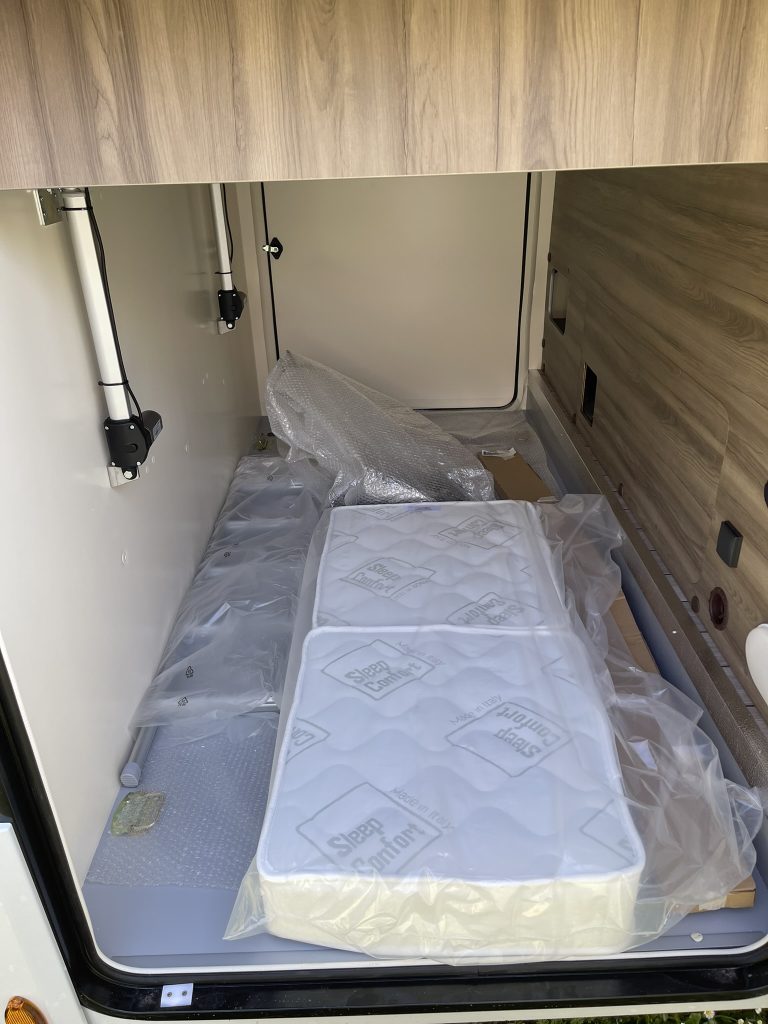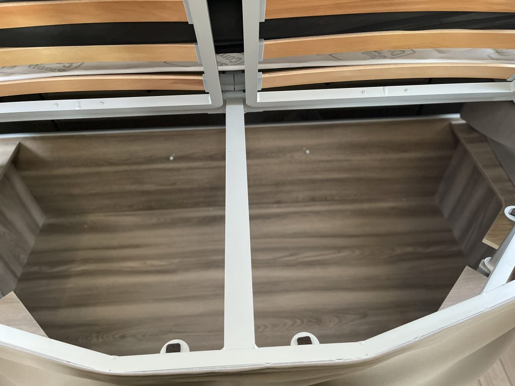 Dispone de 1 cama isla de matrimonio en la parte trasera, 1 cama de matrimonio basculante y otra cama individual en el comedor.