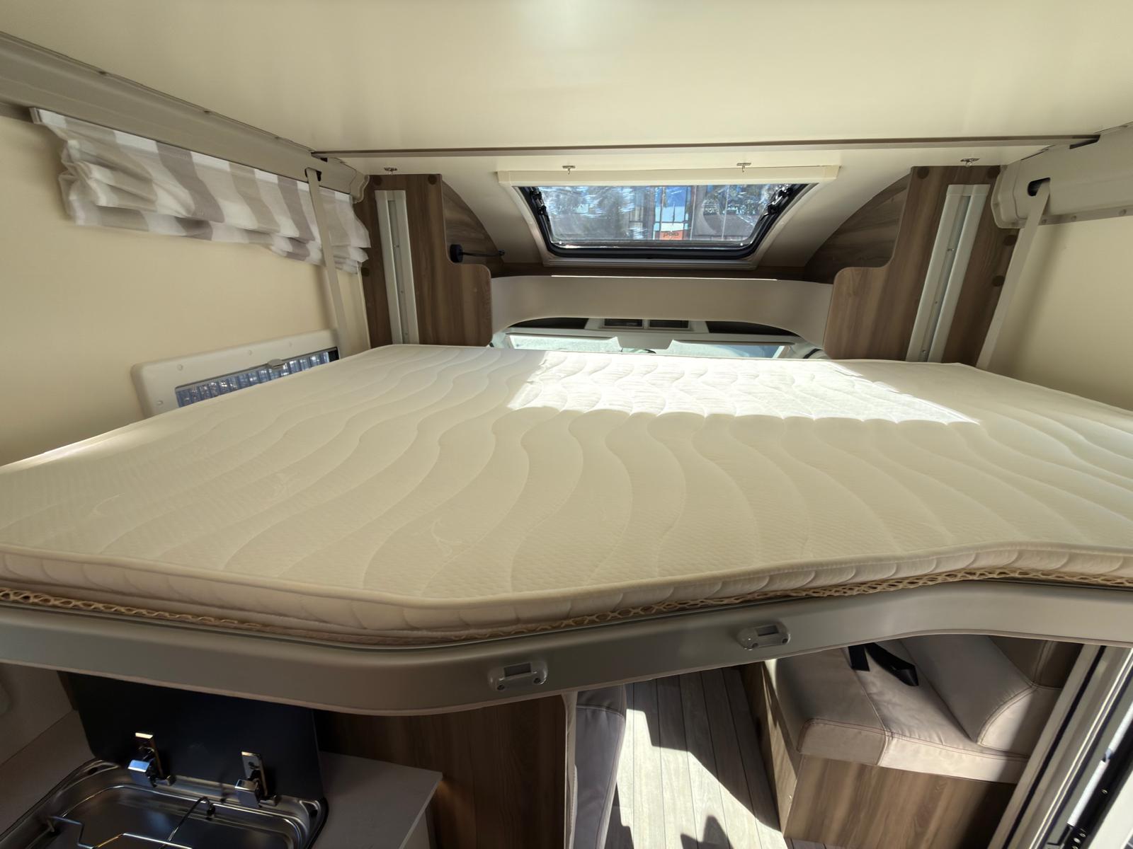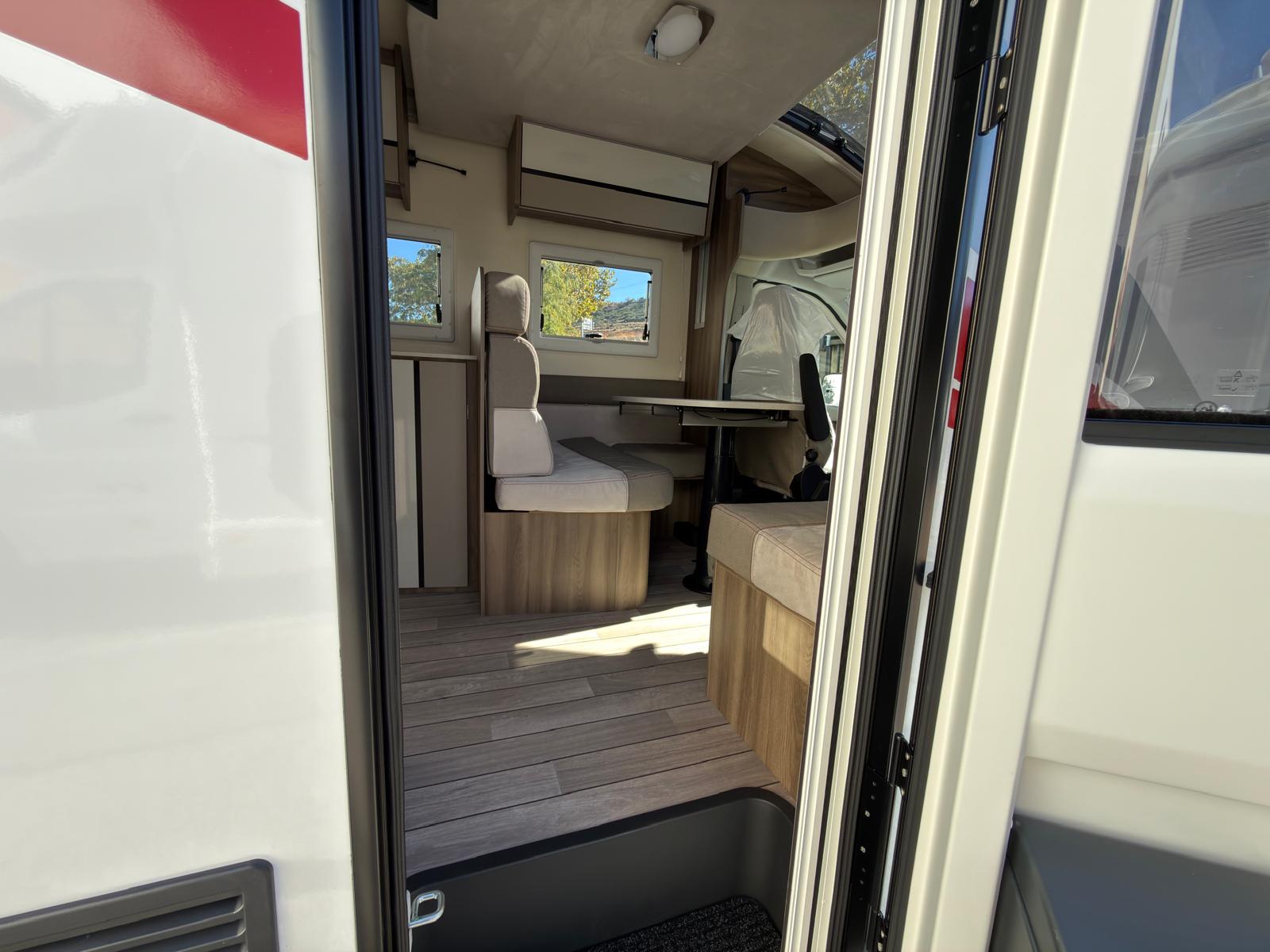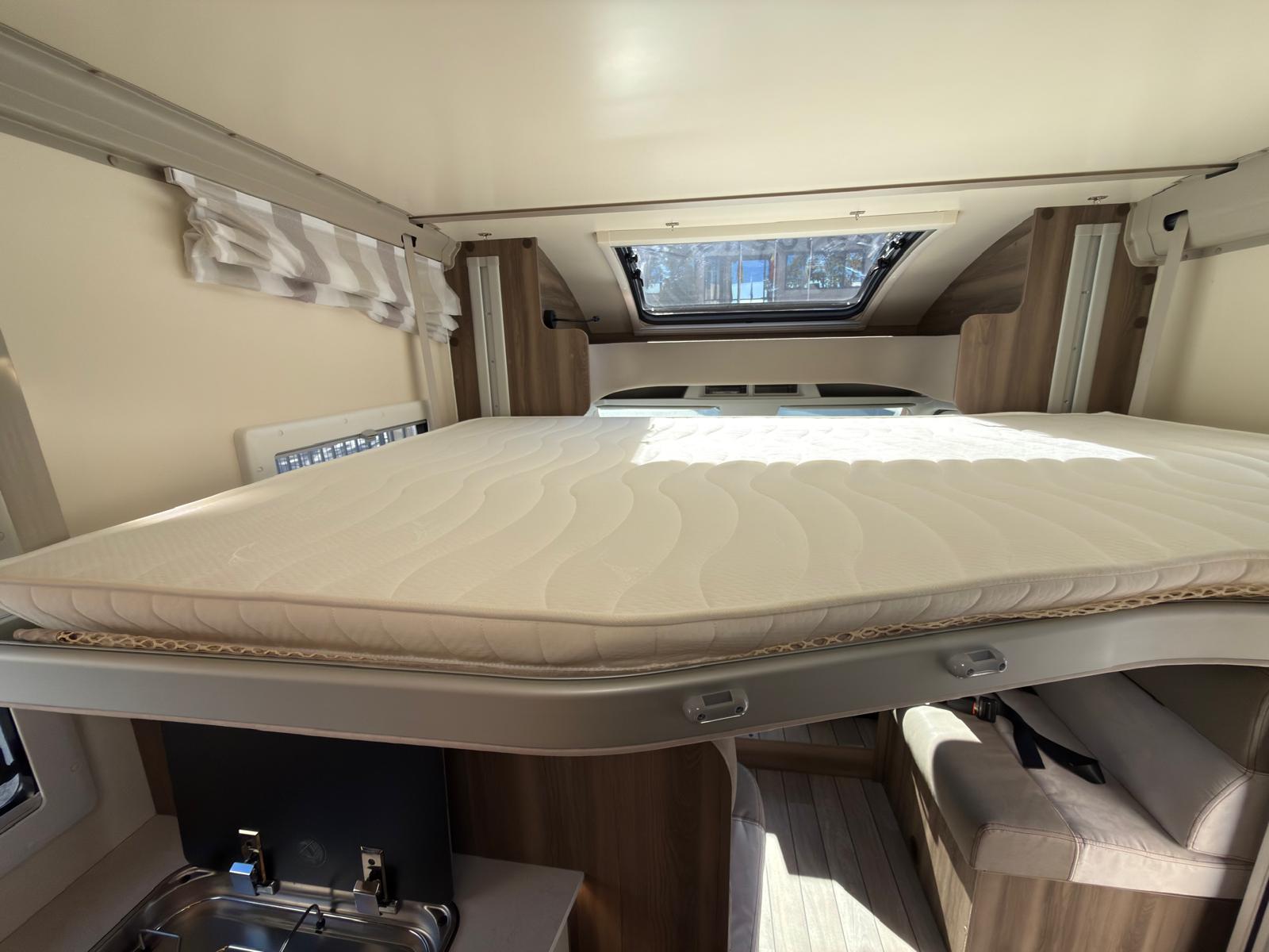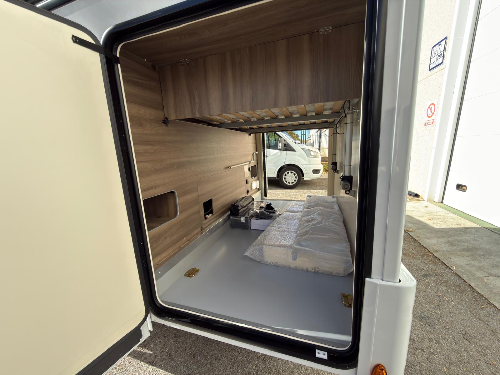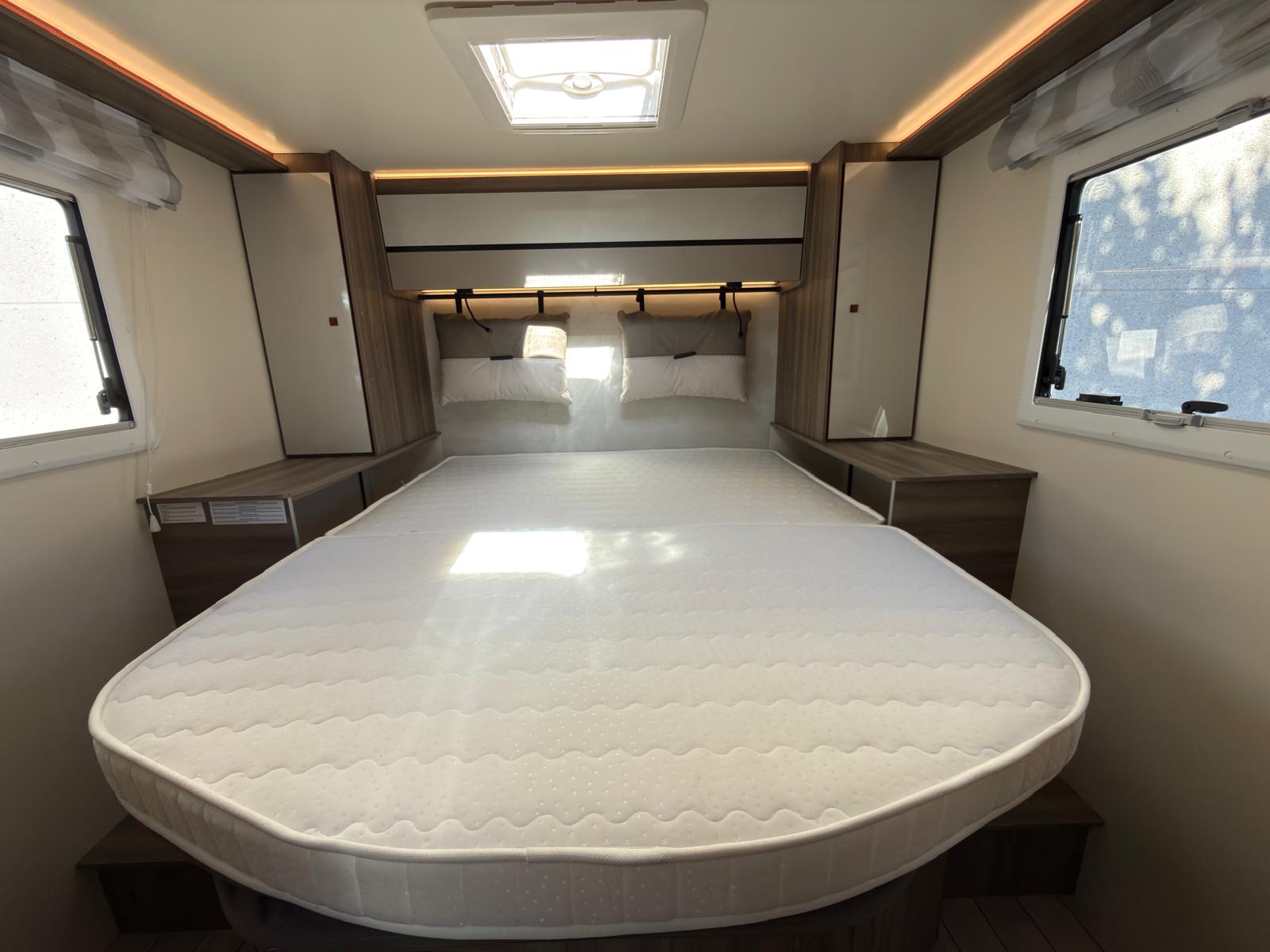 Dispone de 1 cama isla de matrimonio en la parte trasera, 1 cama de matrimonio basculante y otra cama individual en el comedor.