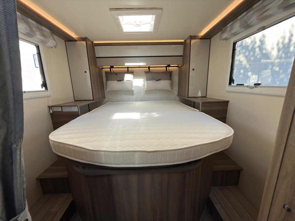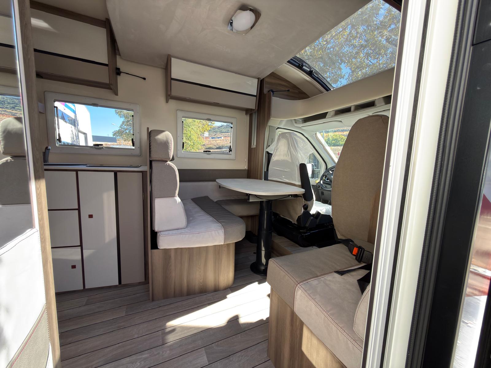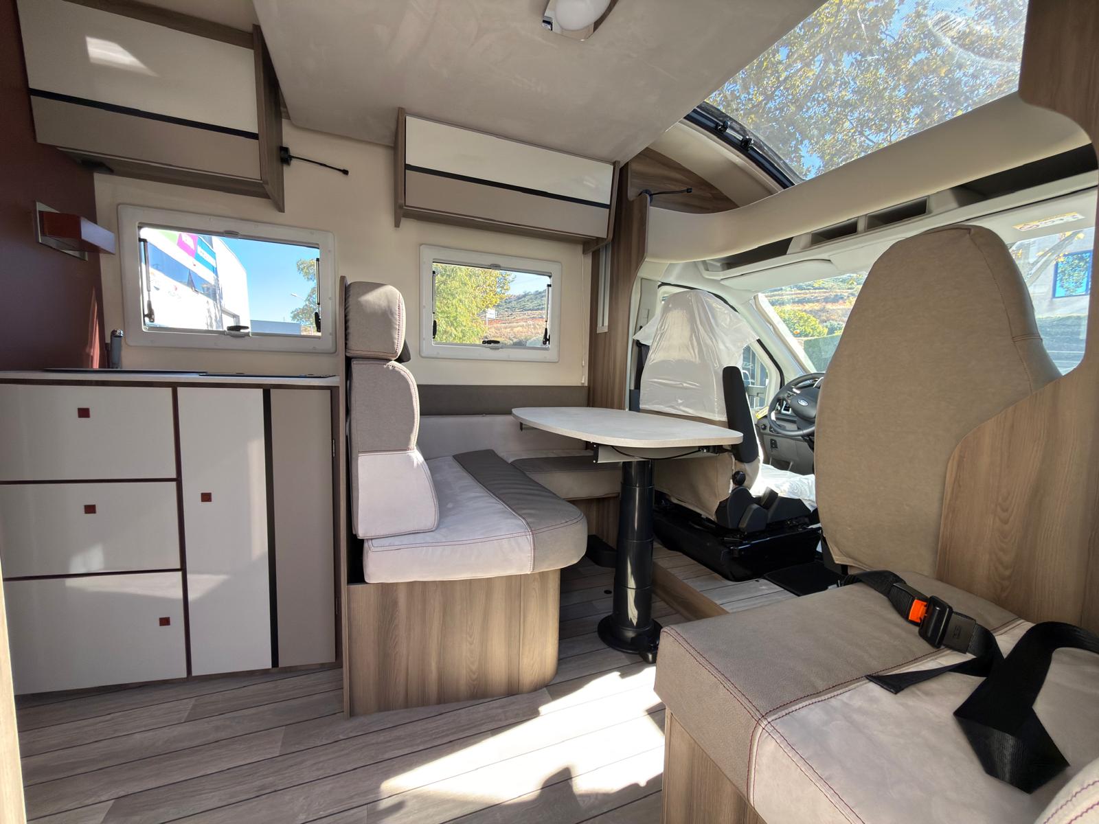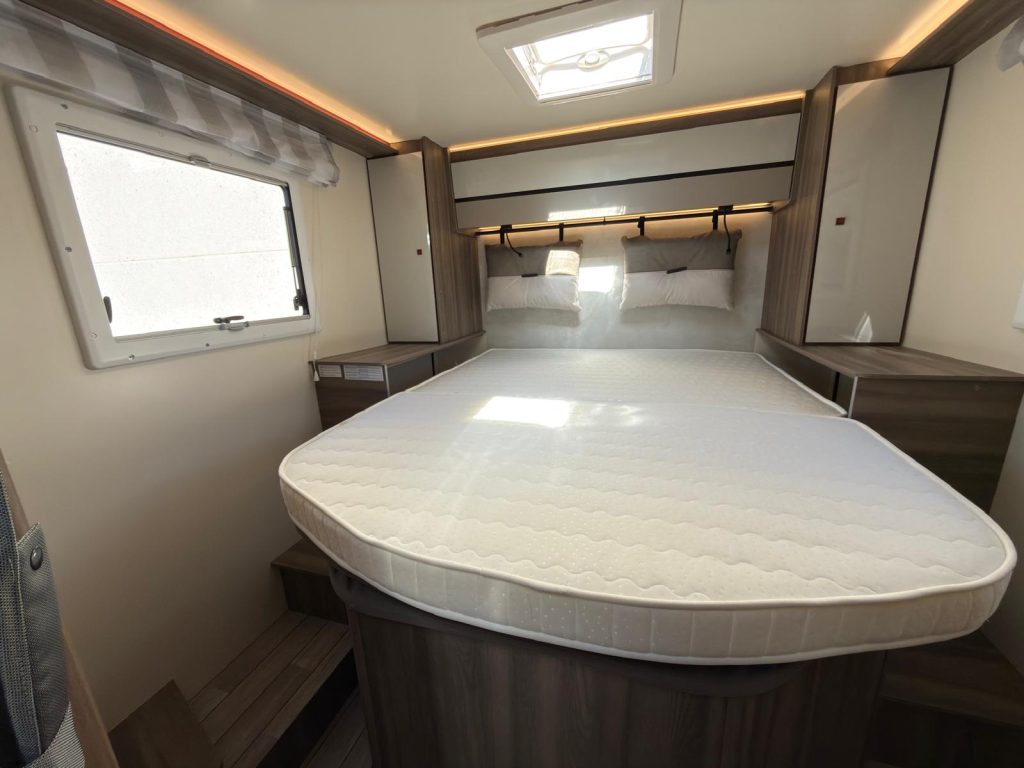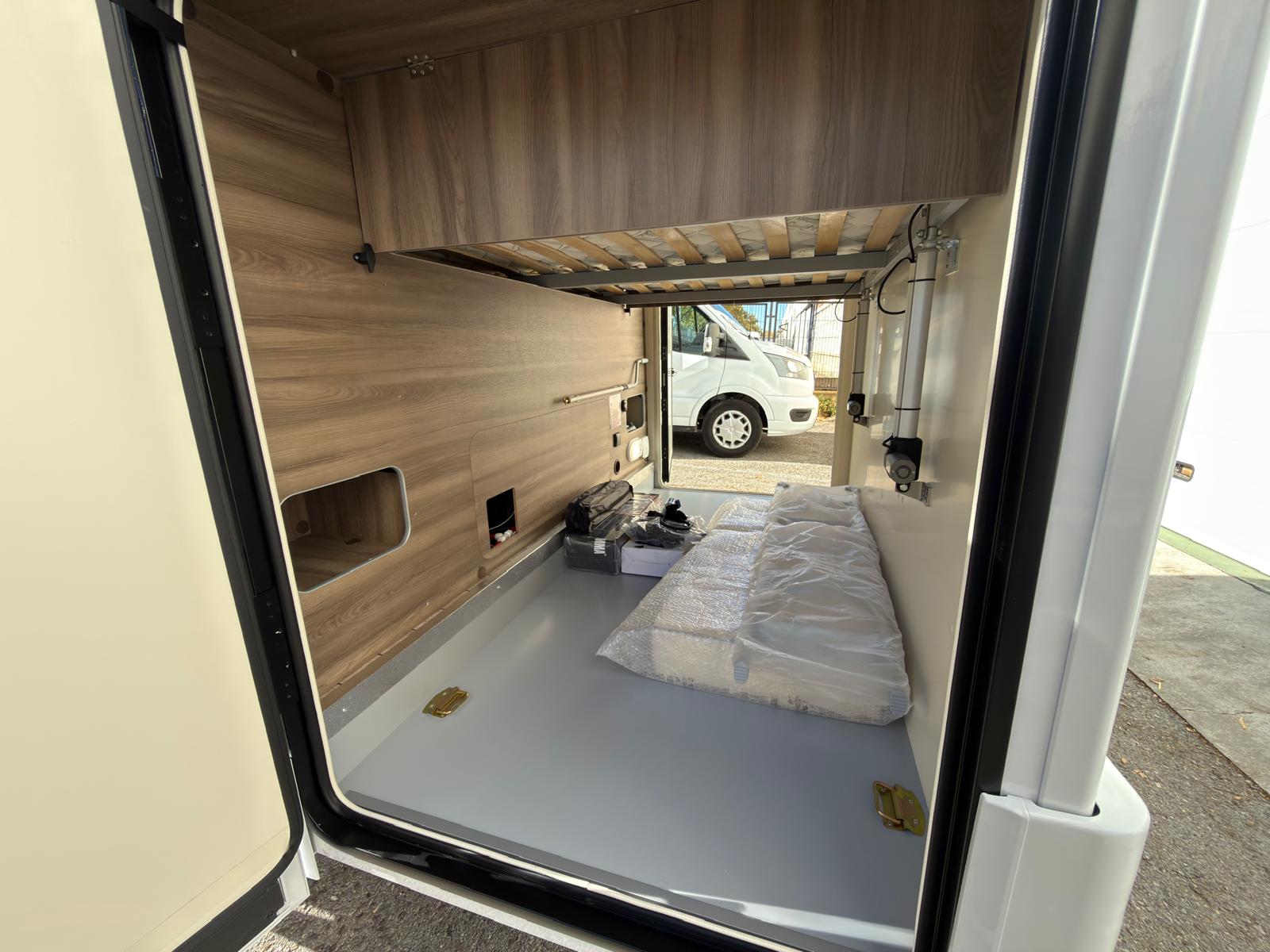 Dispone de 1 cama isla de matrimonio en la parte trasera, 1 cama de matrimonio basculante y otra cama individual en el comedor.