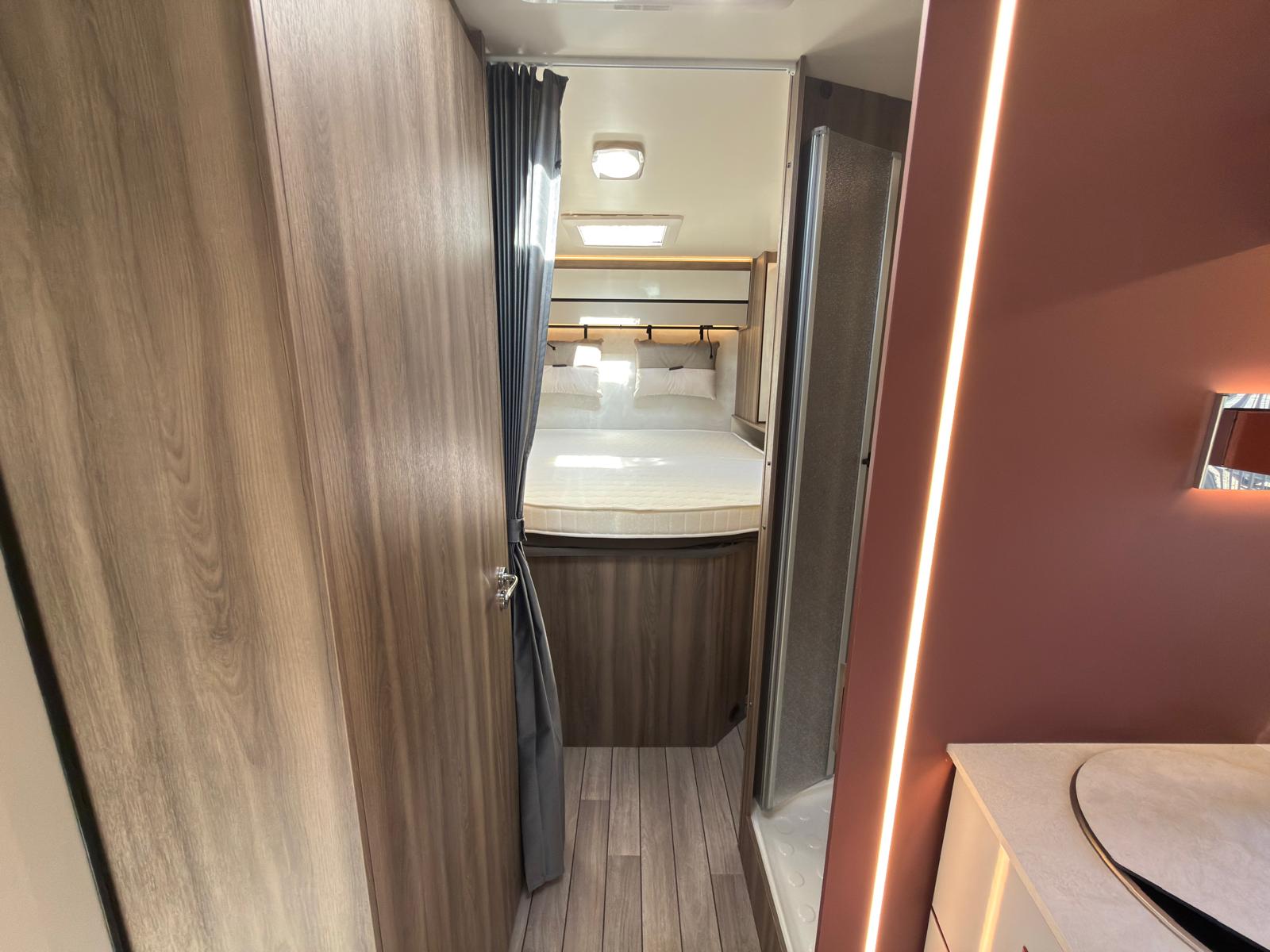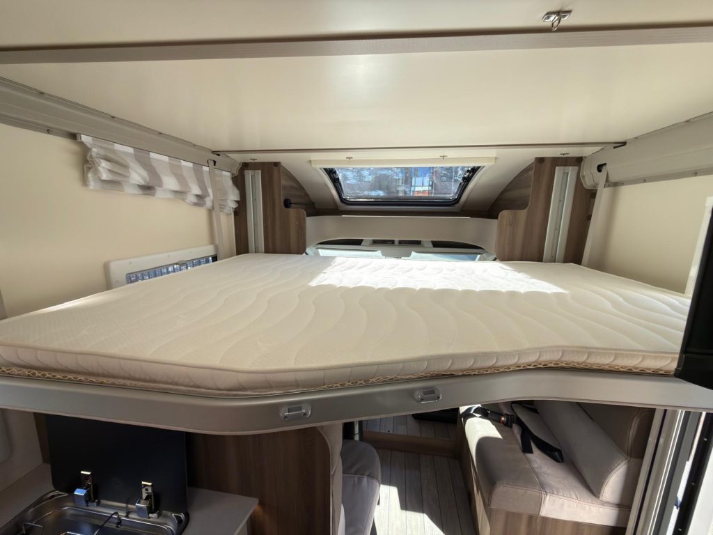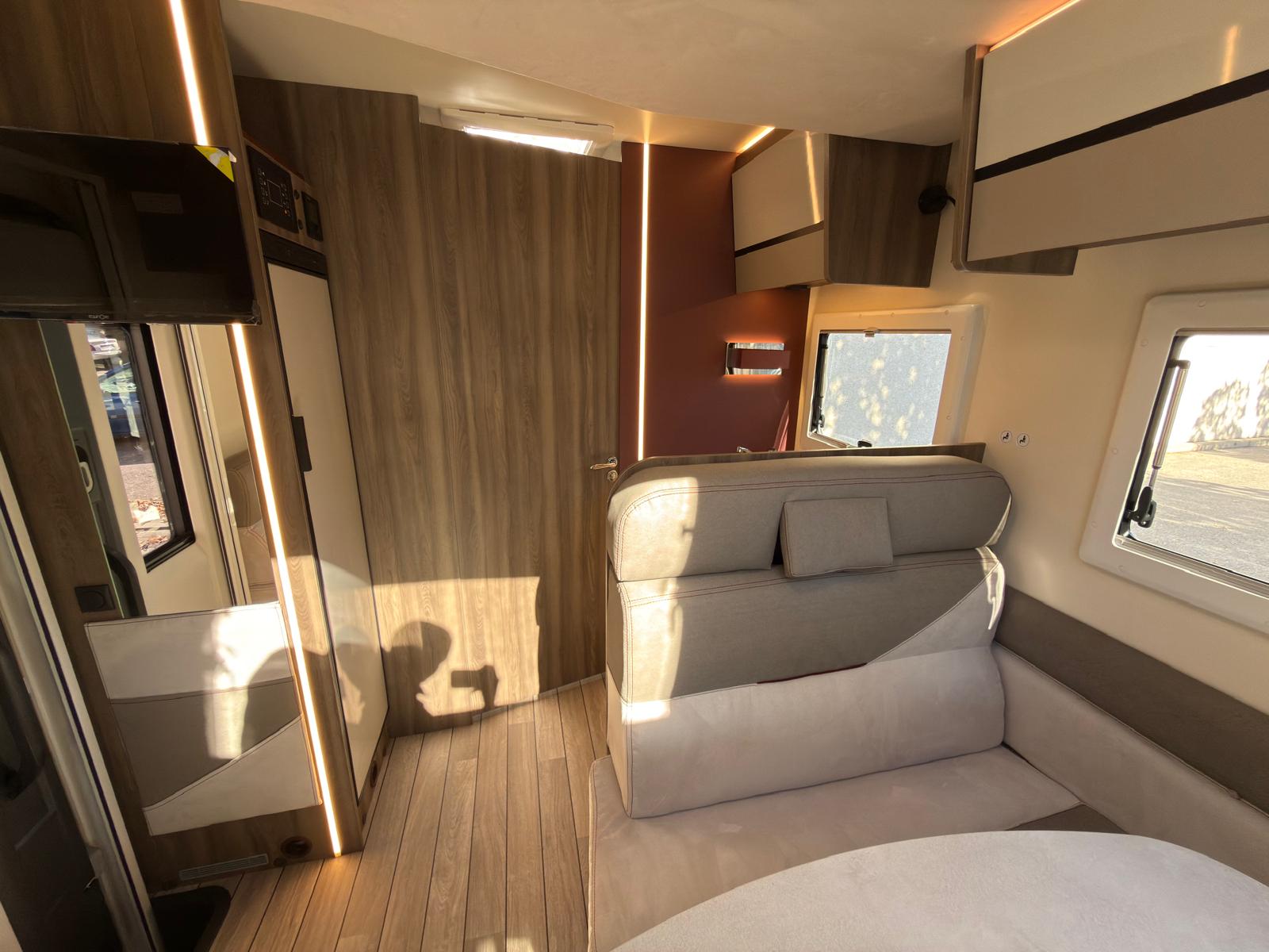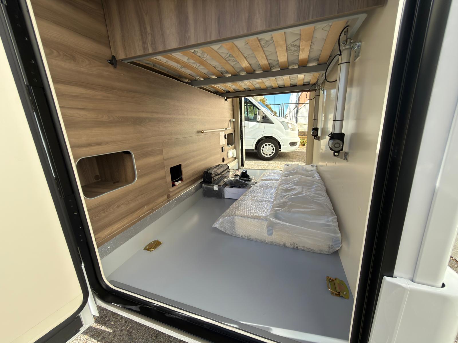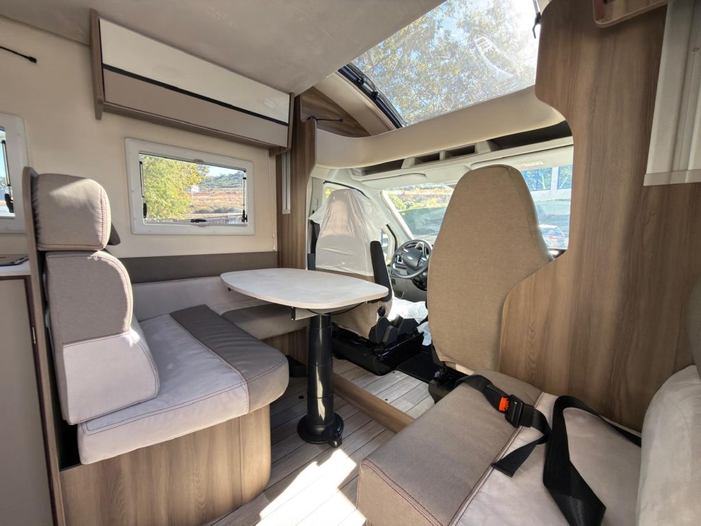 Dispone de 1 cama isla de matrimonio en la parte trasera, 1 cama de matrimonio basculante y otra cama individual en el comedor.