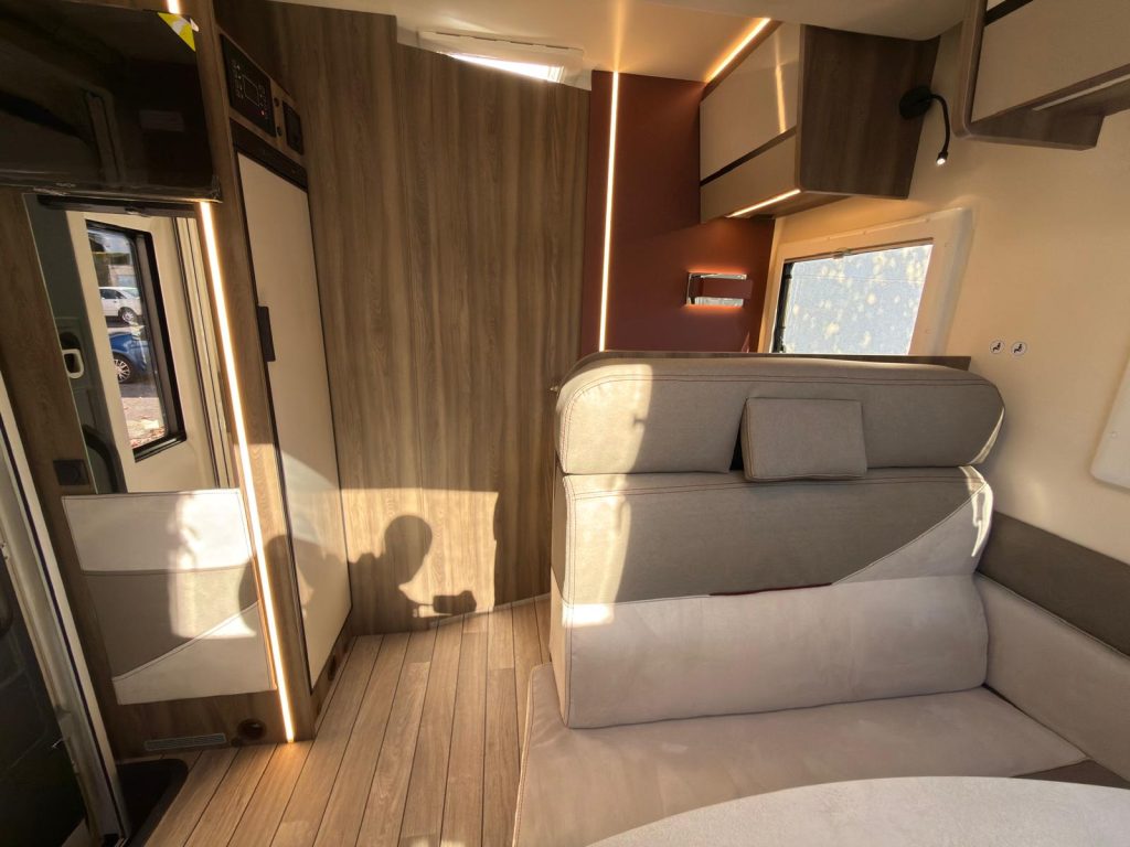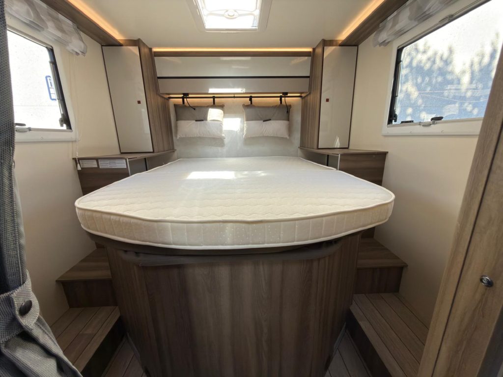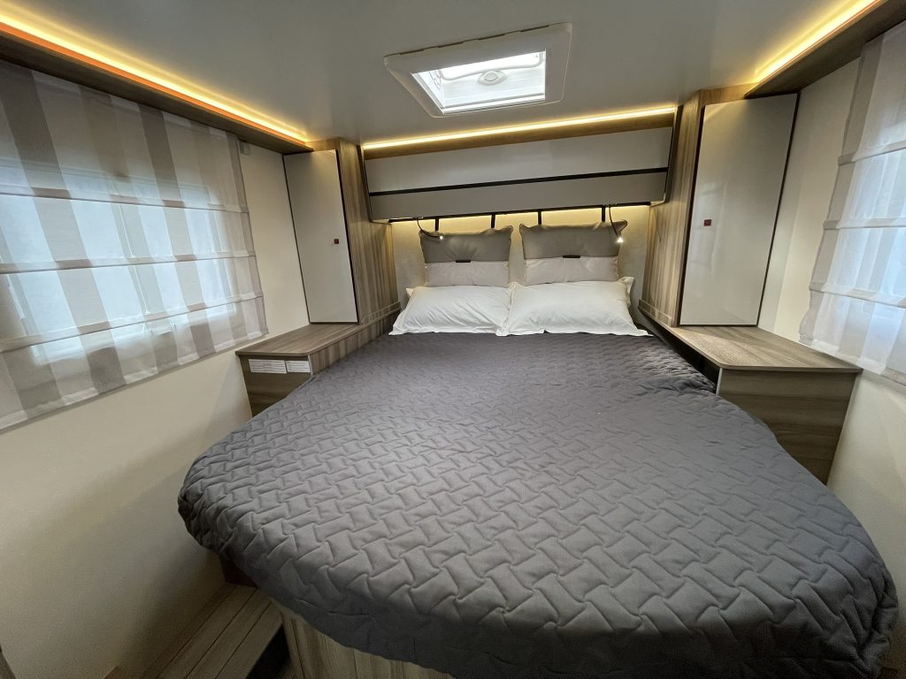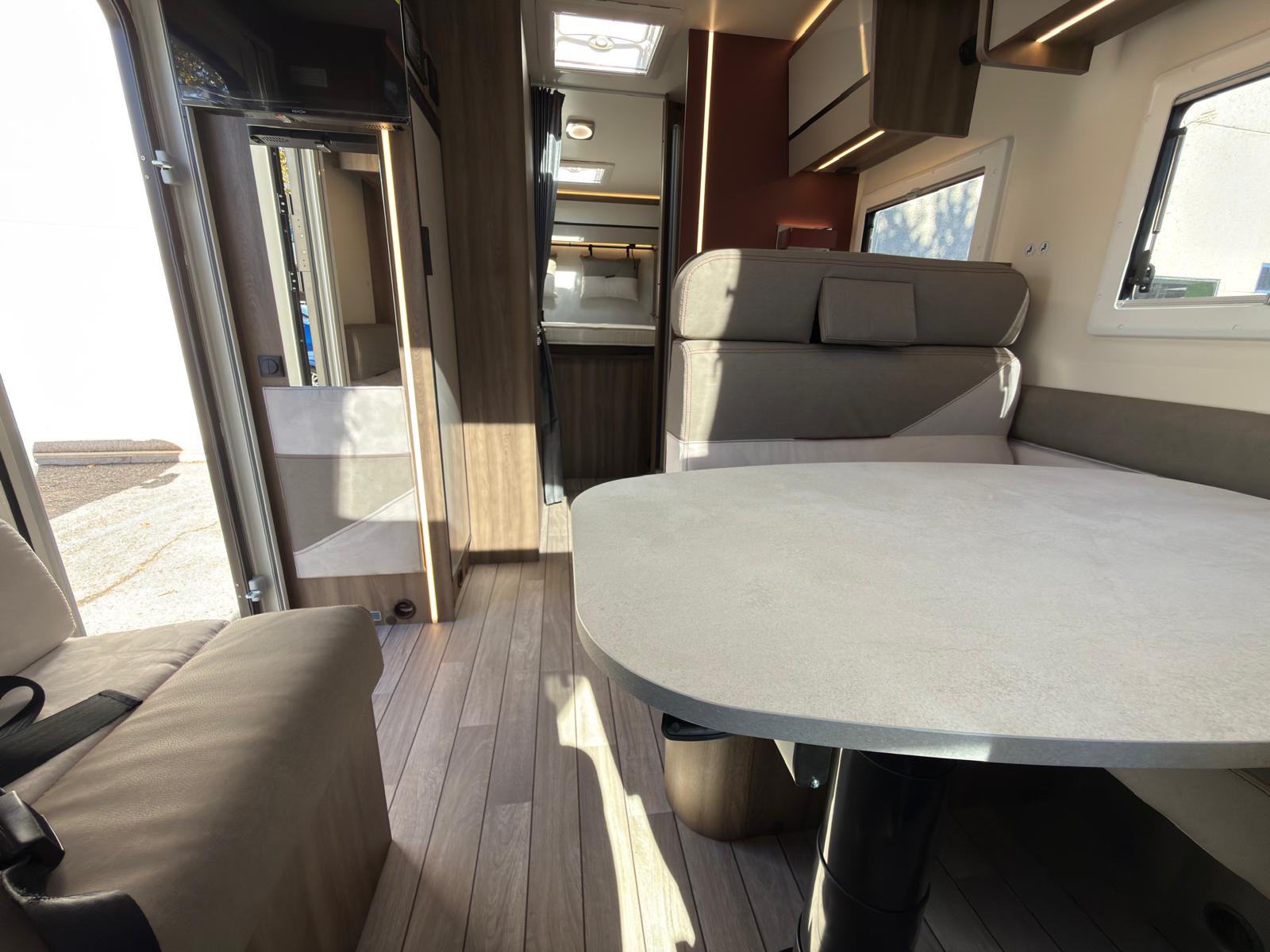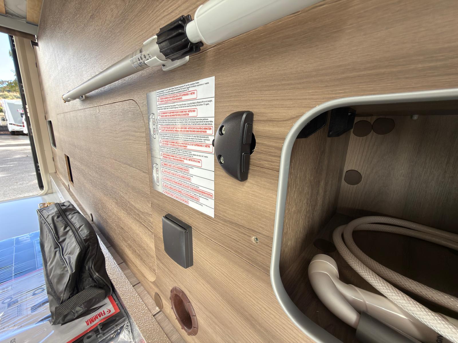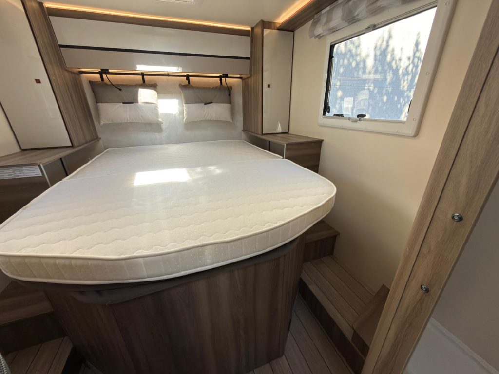 Dispone de 1 cama isla de matrimonio en la parte trasera, 1 cama de matrimonio basculante y otra cama individual en el comedor.