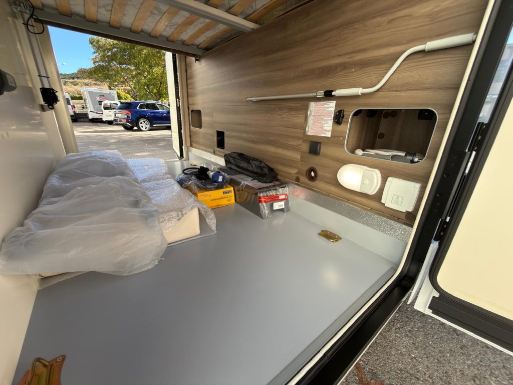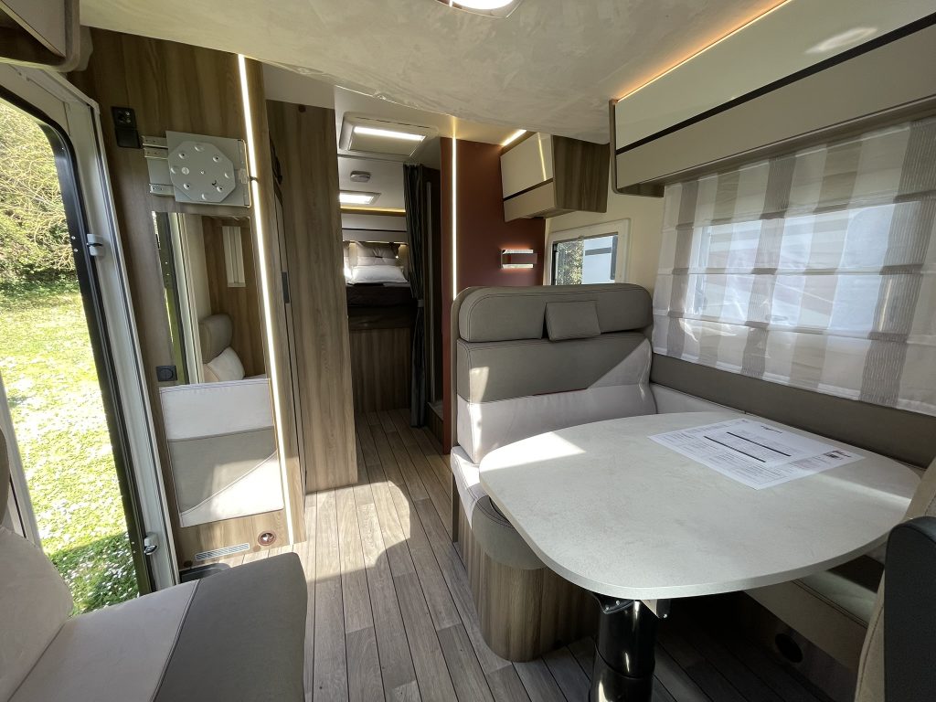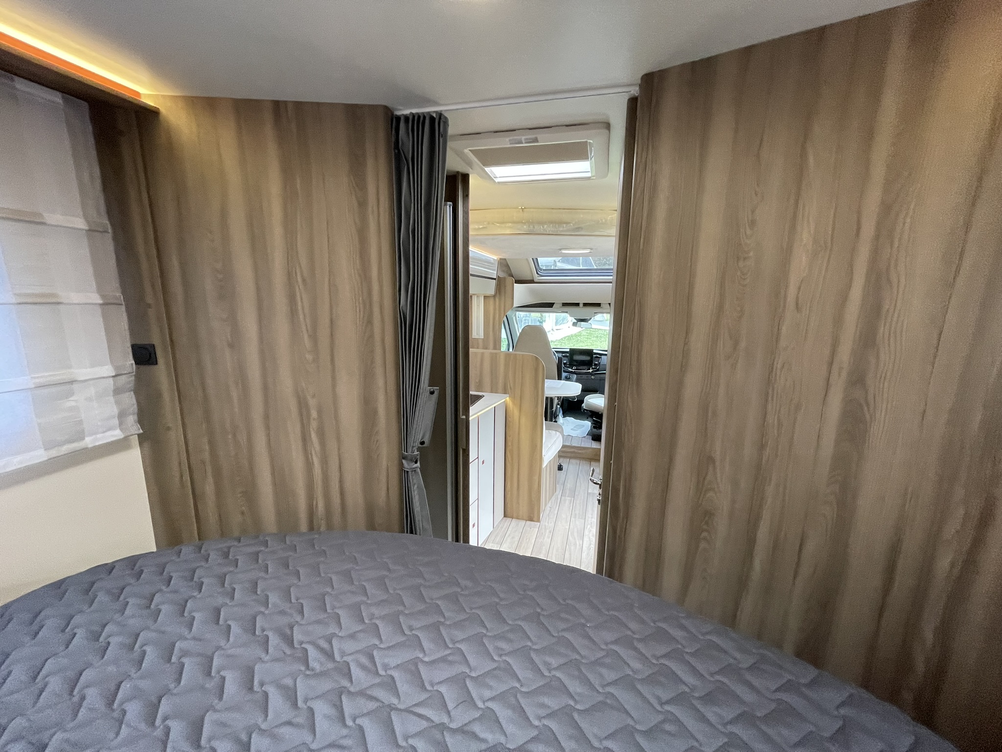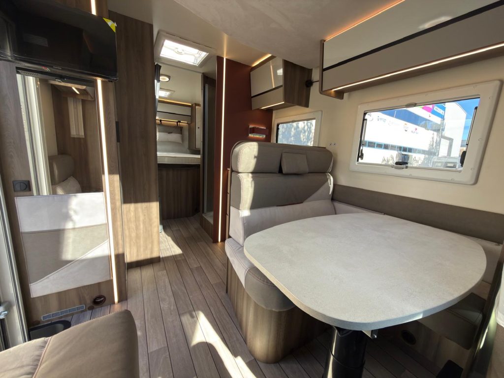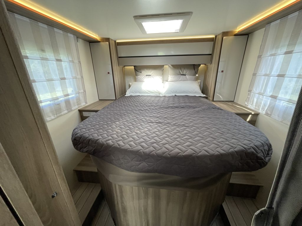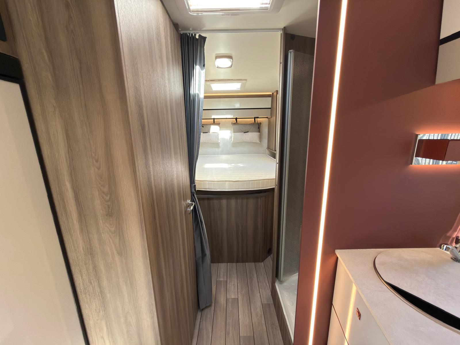 Dispone de 1 cama isla de matrimonio en la parte trasera, 1 cama de matrimonio basculante y otra cama individual en el comedor.