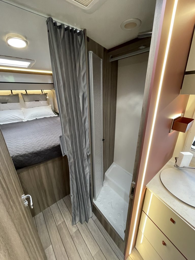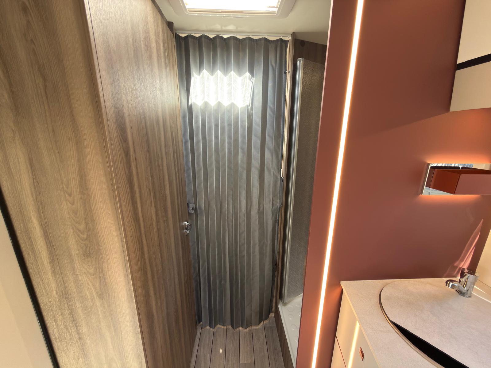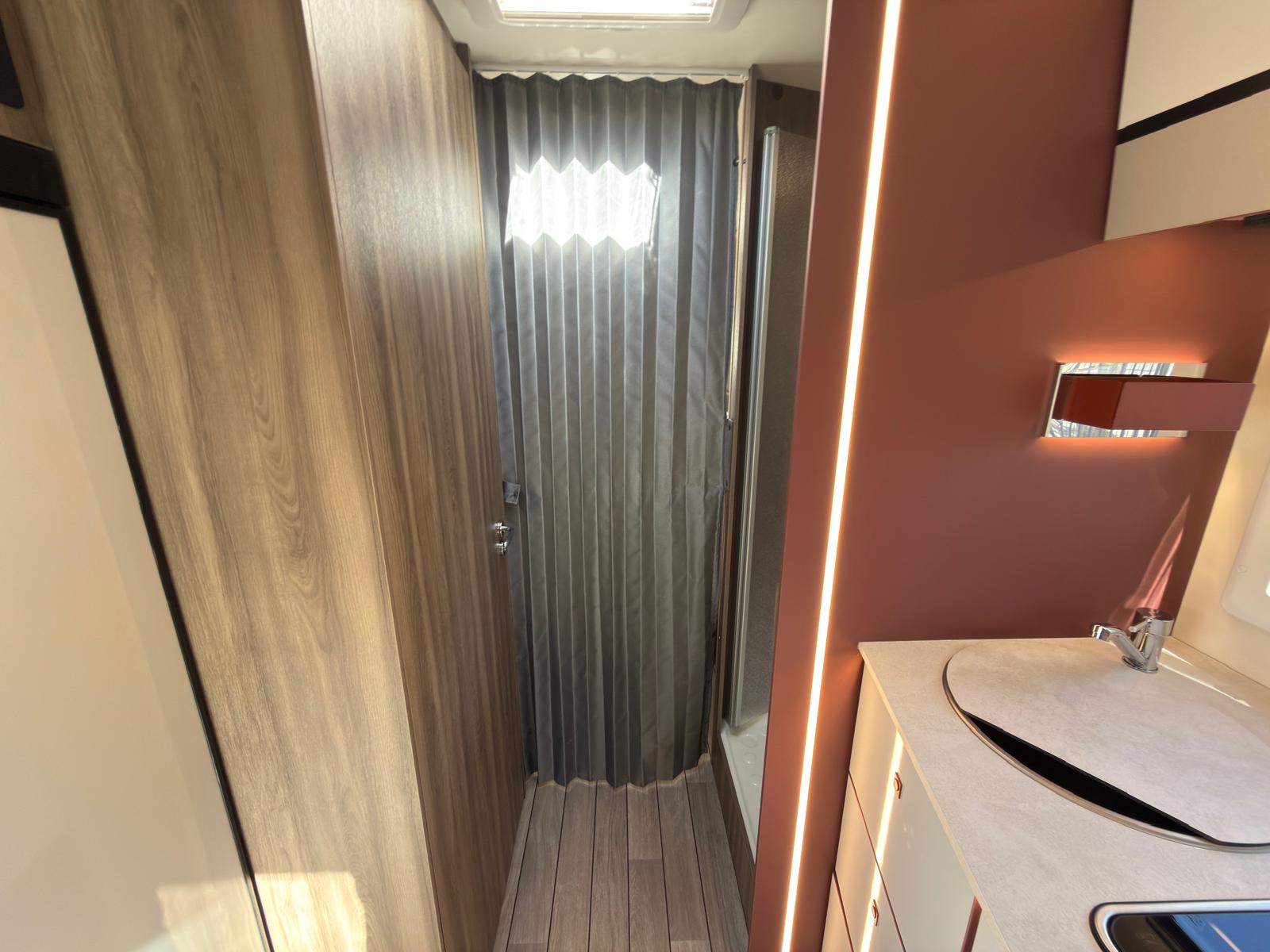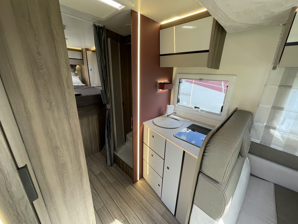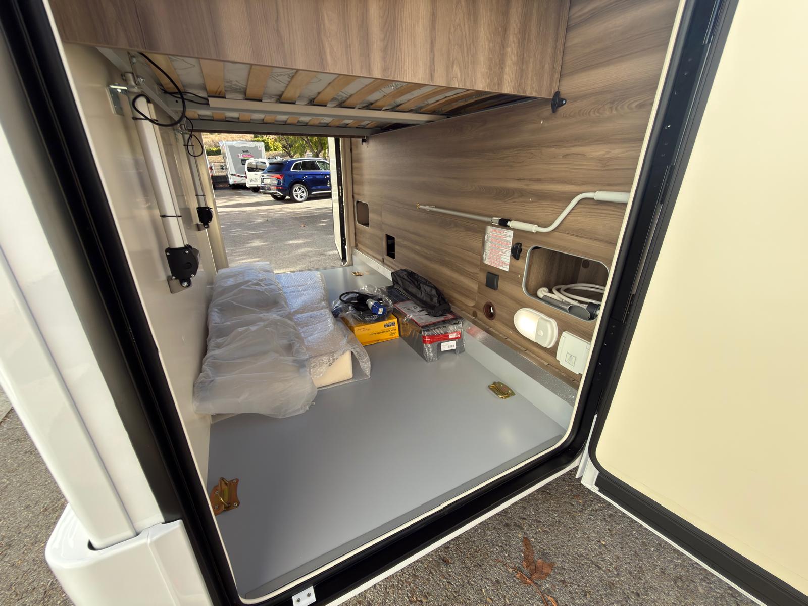 Dispone de 1 cama isla de matrimonio en la parte trasera, 1 cama de matrimonio basculante y otra cama individual en el comedor.