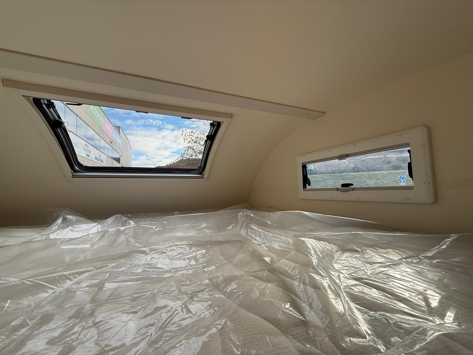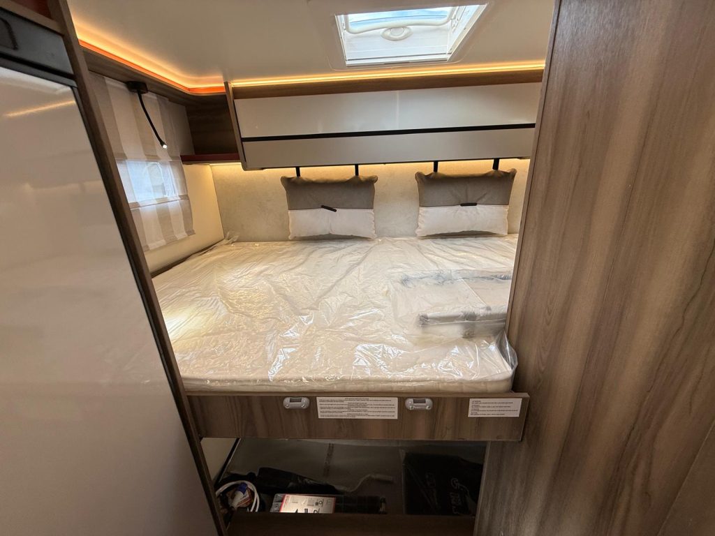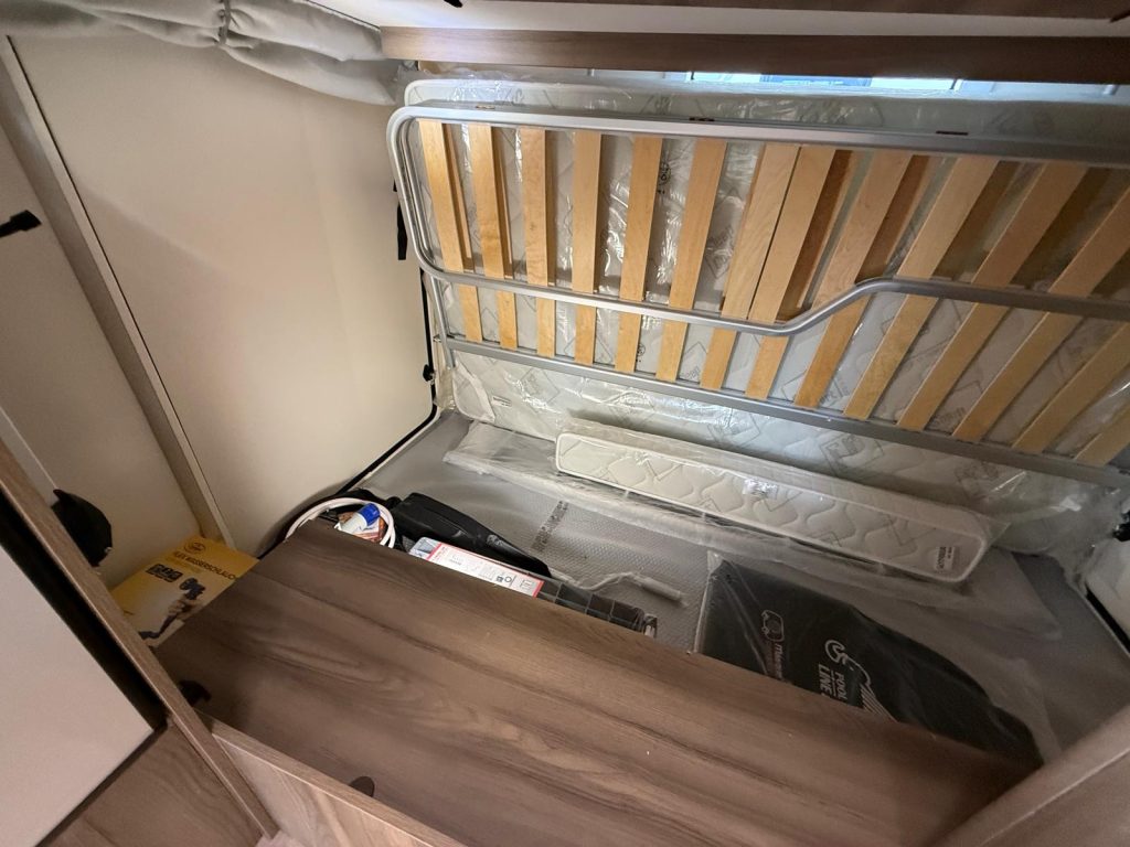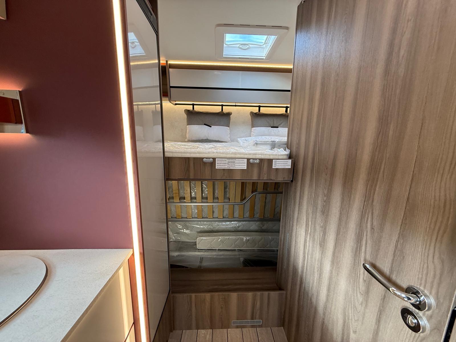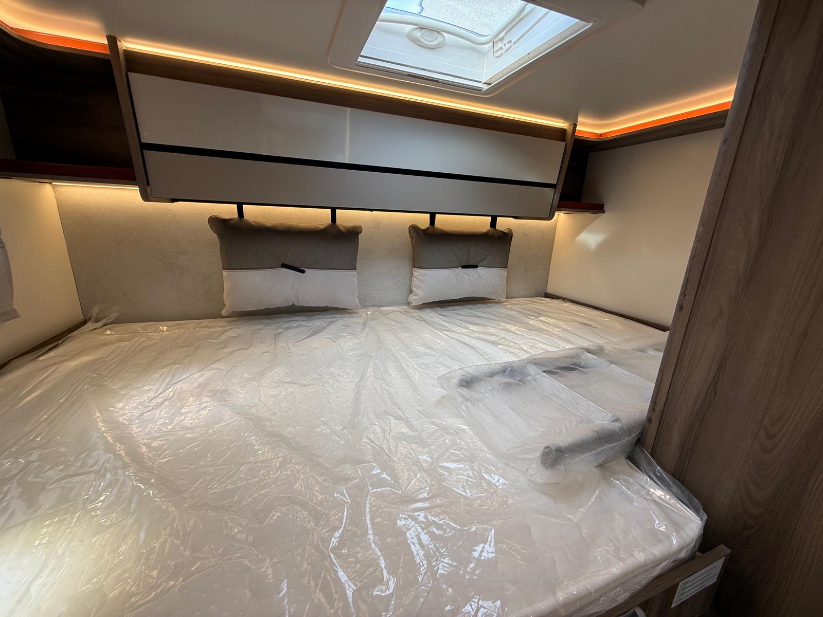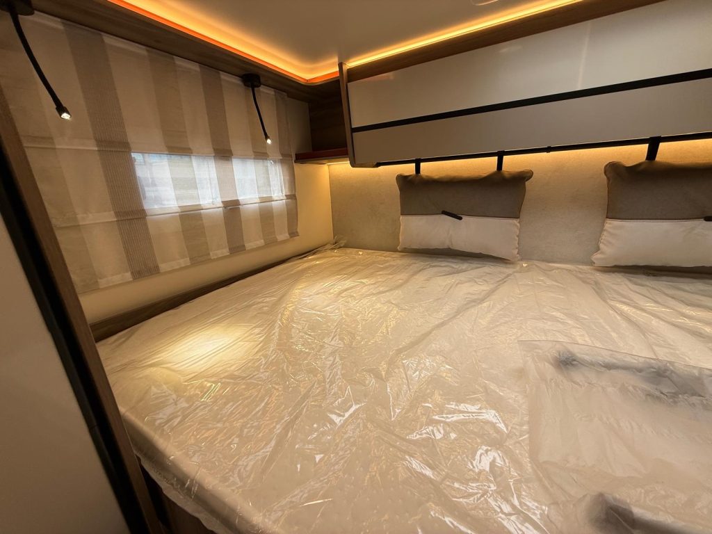 Dispone de 1 litera de matrimonio transversal en la parte trasera, 1 cama de matrimonio encima de la cabina y otra cama de matrimonio en el comedor.