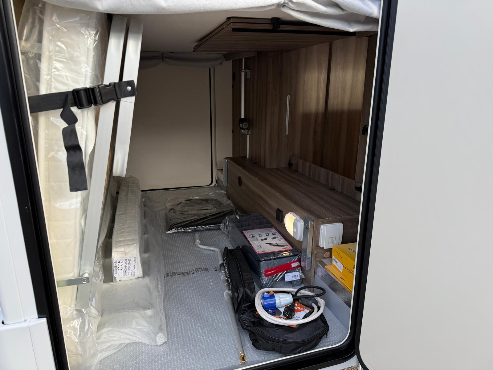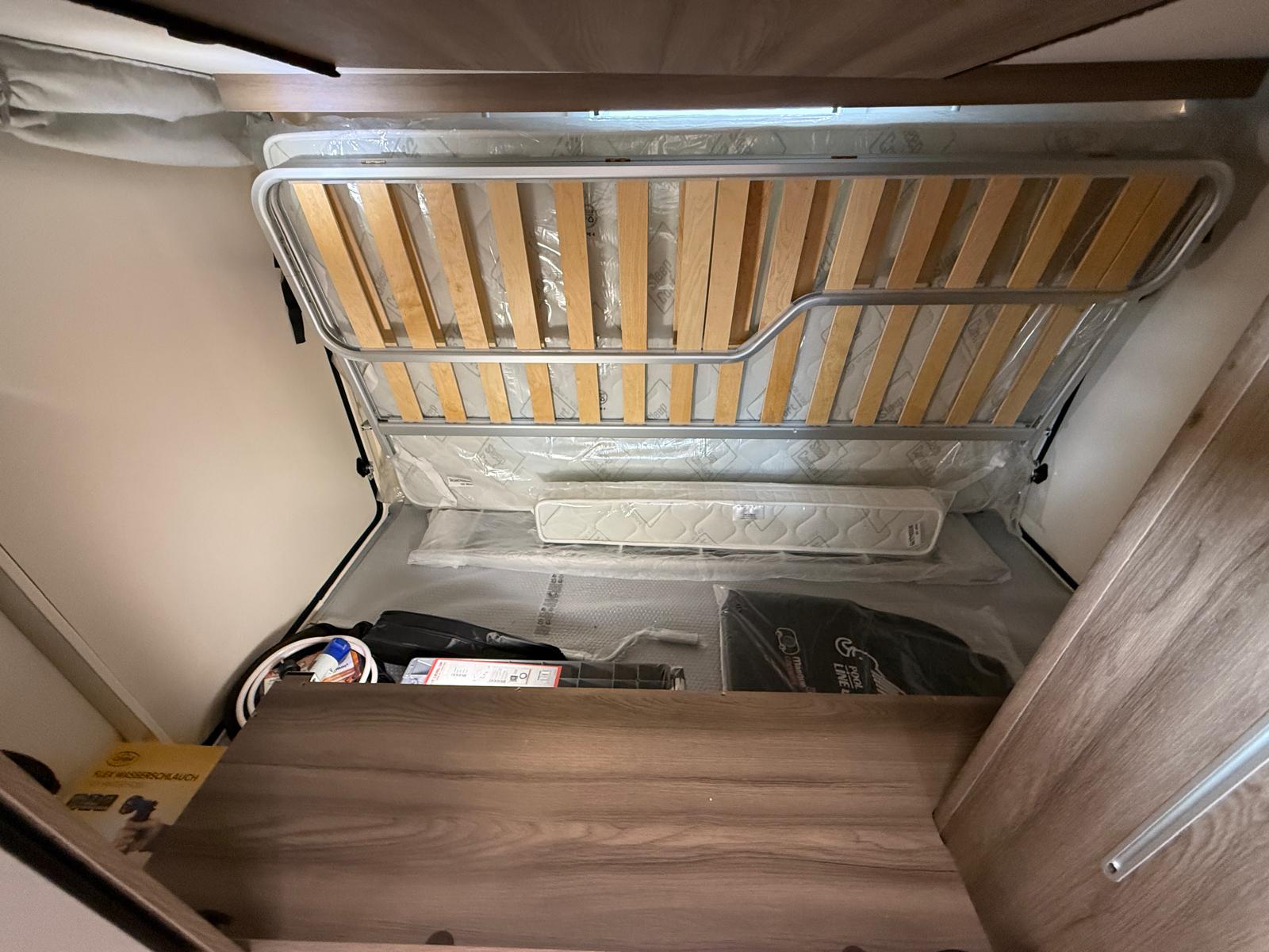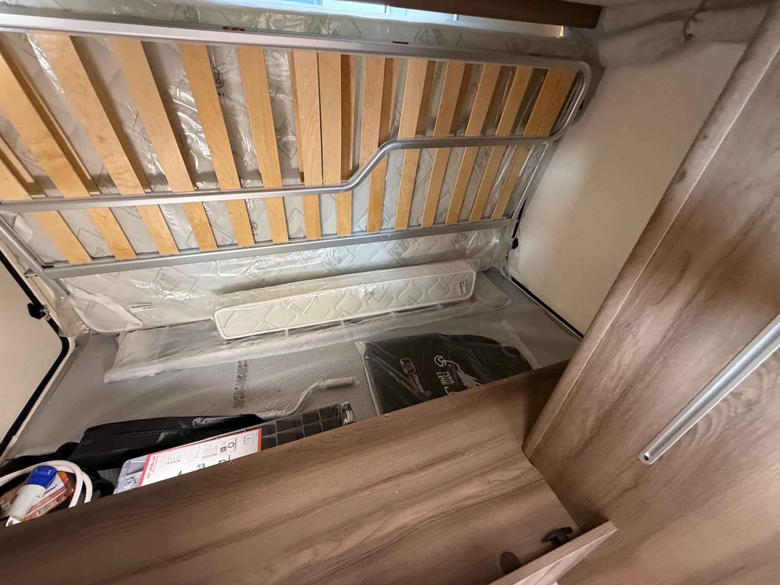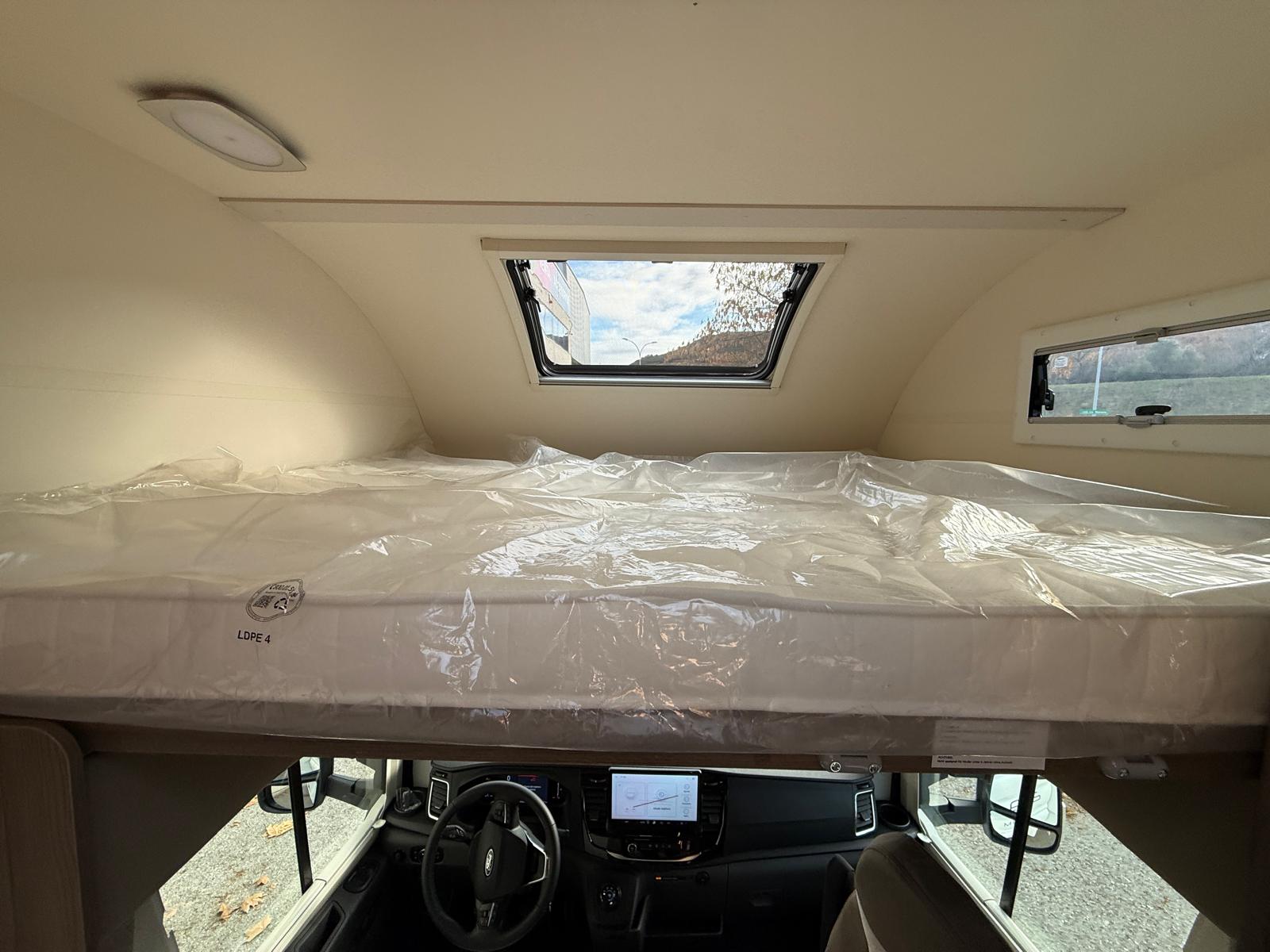 Dispone de 1 litera de matrimonio transversal en la parte trasera, 1 cama de matrimonio encima de la cabina y otra cama de matrimonio en el comedor.