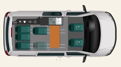 Furgoneta camper compacta, la Panama P12+ se adapta a todas sus necesidades gracias a la banqueta corredera a lo largo de todo el vehículo.