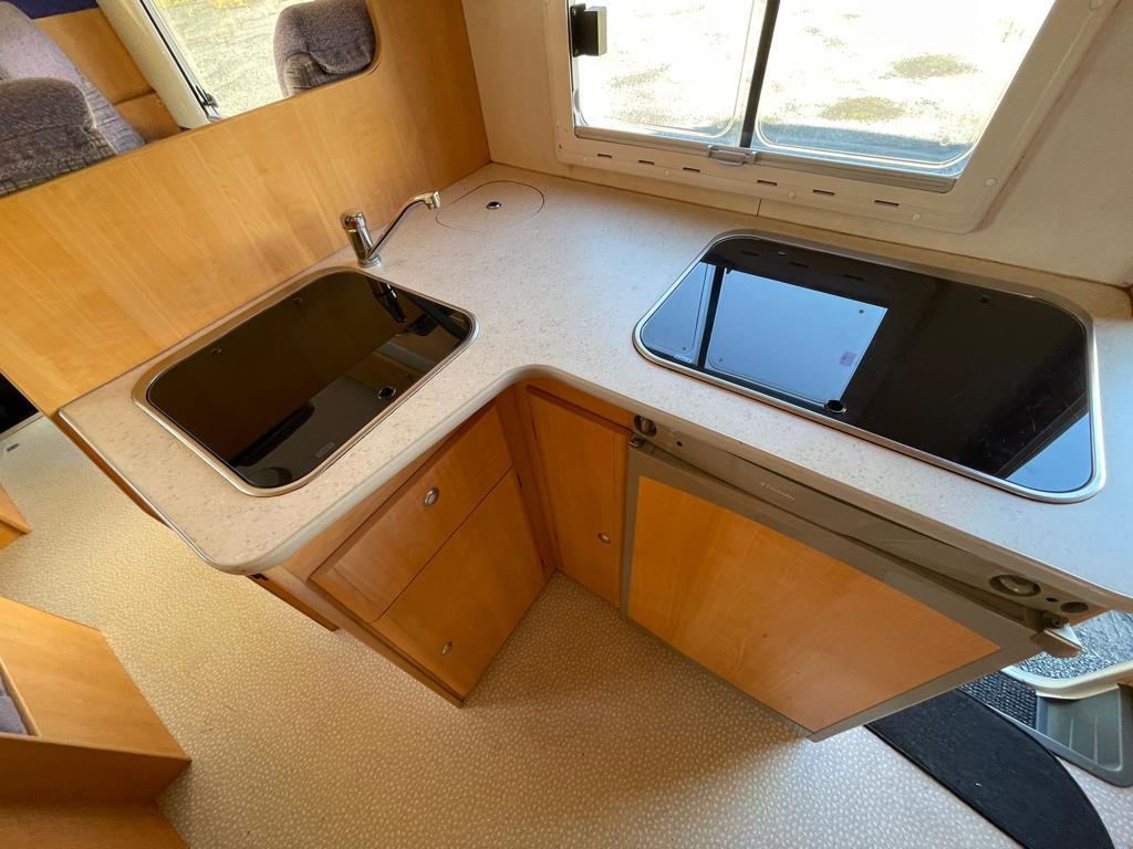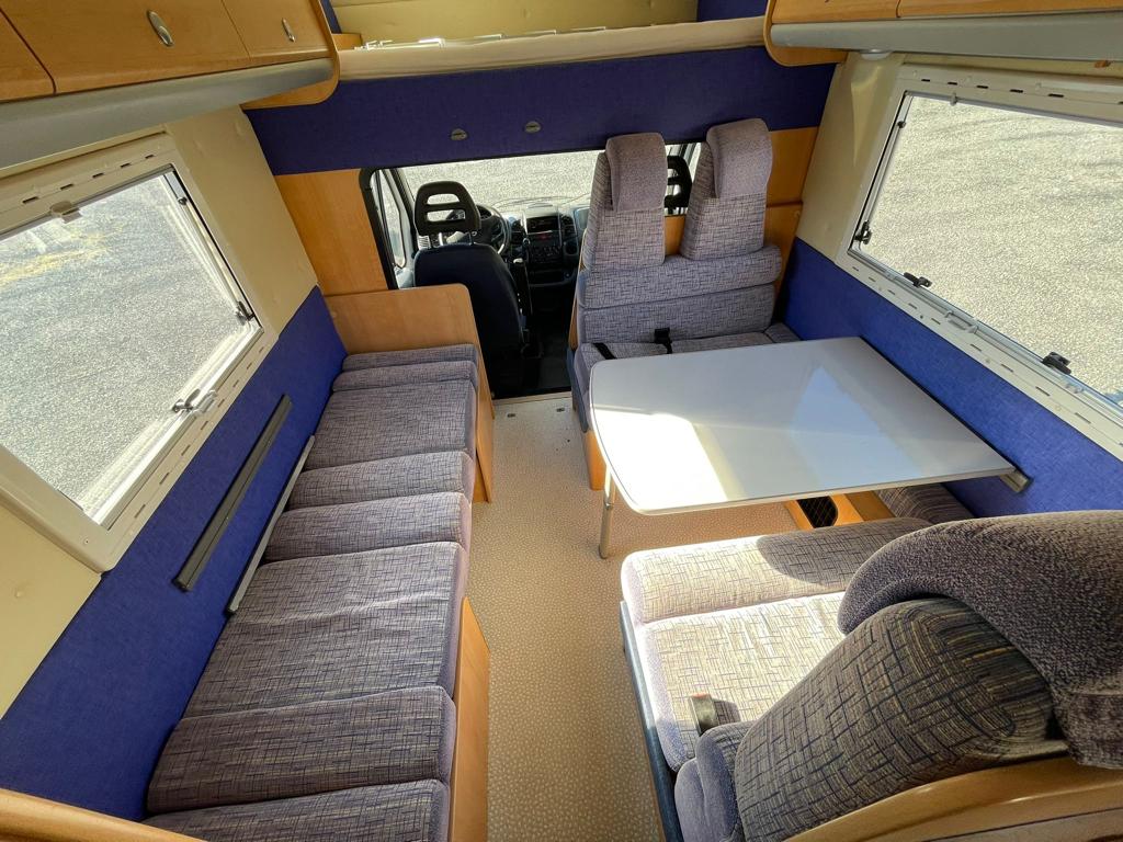 Magnifica Autocaravana capuchina Challenger 171 – Año 2003 con motor Fiat de 128 cv. Tan solo 6,966 m de largo, distribuida con 2 literas traseras, cama en salón y cama matrimonial en capuchina y baño con ducha separada con mampara..
